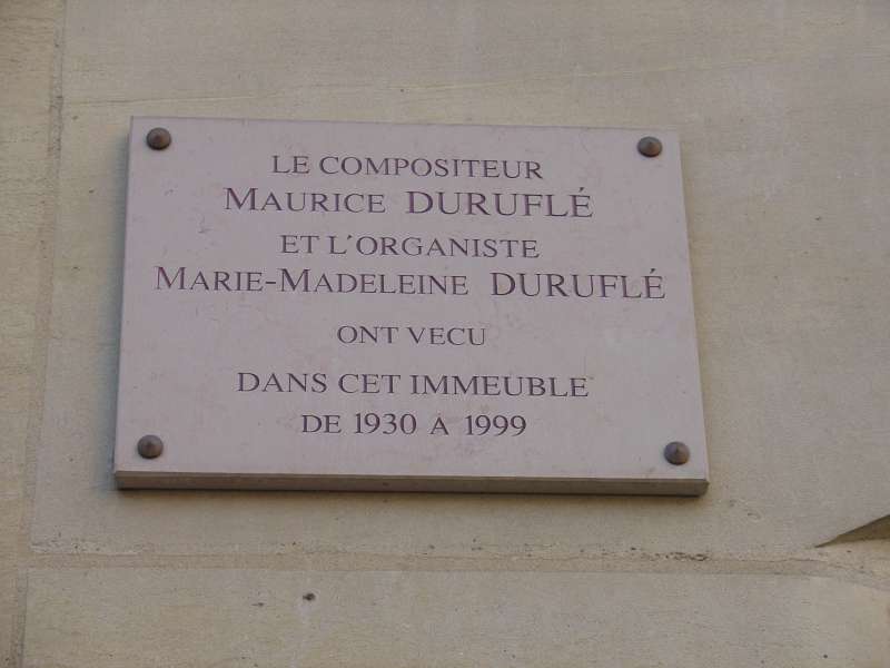 뒤뤼플레가 오르가니스트를 역임했던 생테티엔 뒤몽 성당 바로 앞에 있는 파리 5구 팡테옹 광장 6번지 주택 입구에 모리스 뒤뤼플레와 그의 아내 마리-마들렌 뒤뤼플레의 기념비가 세워져 있다.