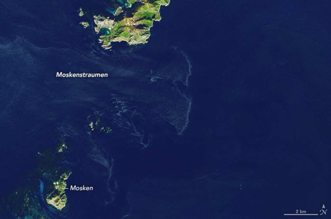 모스켄스트라우멘은 모스케네스 섬의 로포텐 곶(Lofoten Pointno, 모스케네스 시)과 베뢰이 시의 작은 섬인 모스켄 사이에 위치한다. 이 섬들과 대서양 사이의 얕은 곳과 깊은 베스트피오르드를 통해 강한 조류가 흘러 와류와 소용돌이를 형성한다. 가장 큰 소용돌이는 지름이 약 40m에서 50m에 달하며, 진폭이 최대 1m인 수면 물결을 유발한다.[9]