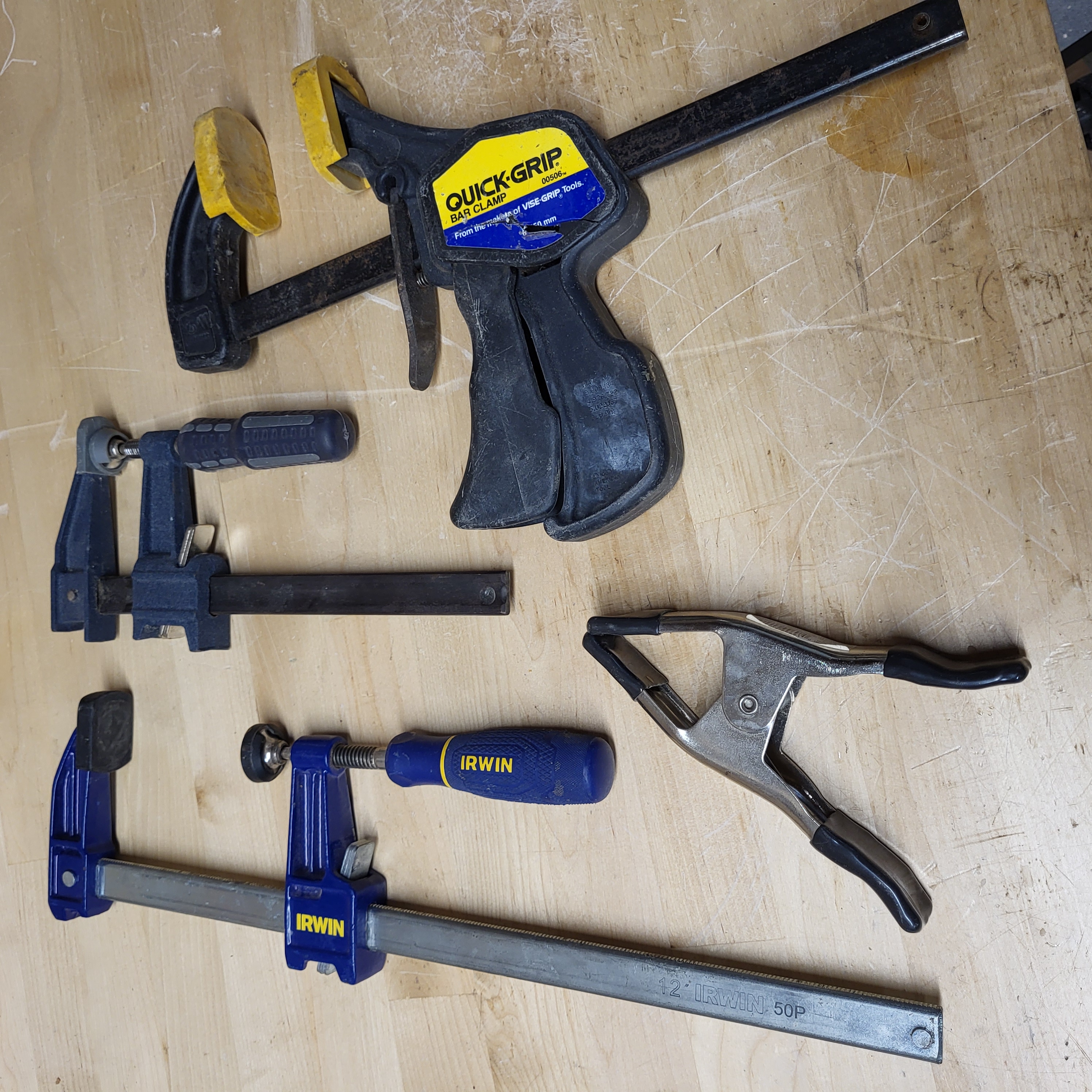 수공구는 손으로 잡고 사용하는 도구이다. 날이 있는 목공 수공구는 숫돌 지그와 숫돌을 사용하여 날카롭게 해야 한다. 더 새로운 방법은 사포를 사용하는 것이다.[19] 현대에 더 흔하게 사용되는 수공구는 다음과 같다.| 클램프 | ![]() | 클램프는 가공물을 작업하는 동안 고정하는 데 사용된다. 클램프는 작은 C형 클램프에서 매우 큰 바 또는 스트랩 클램프에 이르기까지 모든 모양과 크기로 다양하다.[20] 바이스는 필요에 따라 임시 또는 영구적으로 장착된 클램프의 한 형태이다. 목공 바이스는 목수의 필요에 맞게 특화된 바이스이다. 다양한 유형이 개발되었다. |