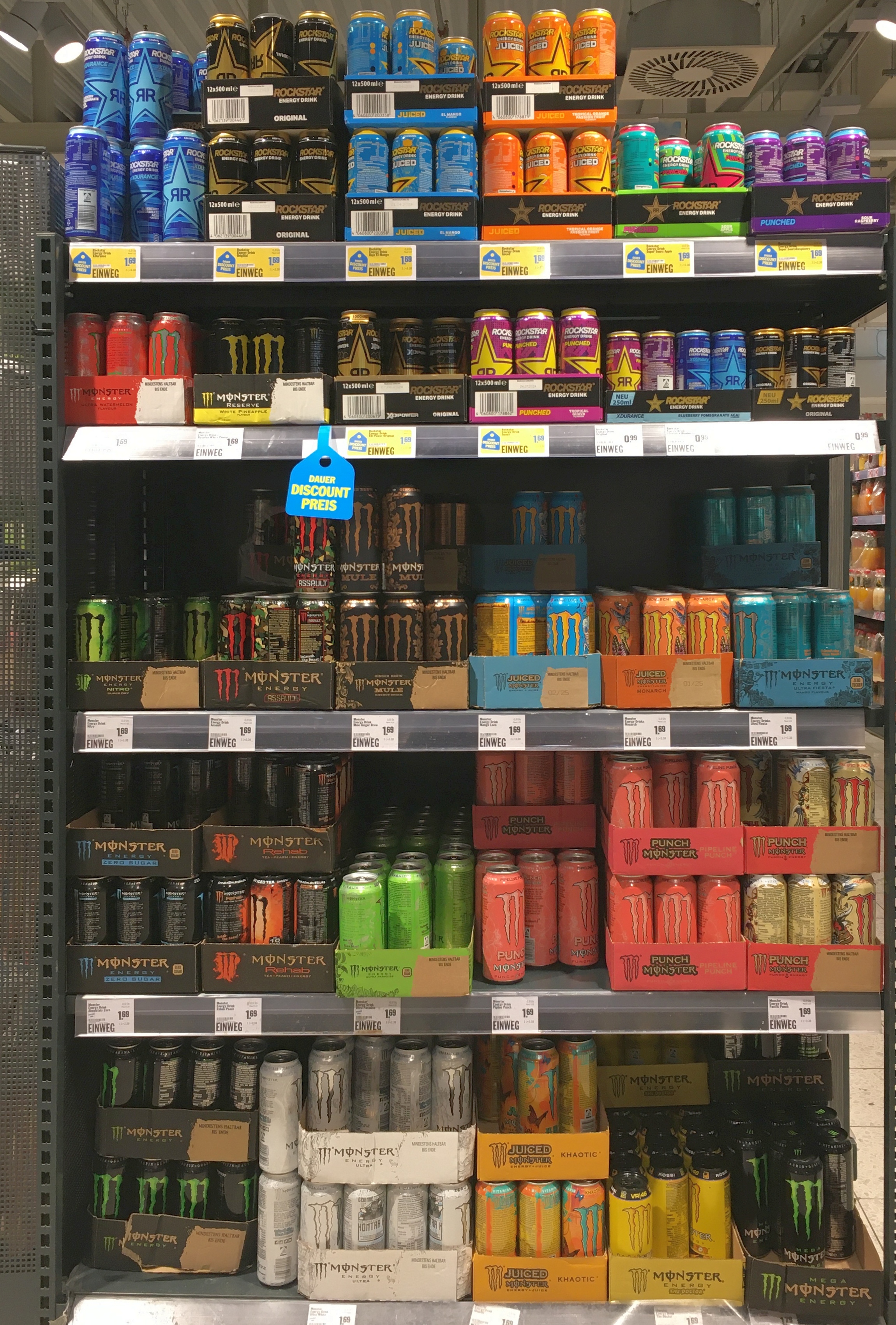 포장에는 일반적으로 하루 48oz 이상(호주에서는 하루 500ml) 섭취하지 않도록 권고하는 경고 라벨이 포함되어 있으며, 임산부나 카페인에 민감한 사람에게는 권장되지 않는다. 일본에서는 약사법에 따라 타우린 대신 L-아르기닌을 사용한다.[116] 일본에서 판매되는 몬스터 에너지의 카페인량은 100ml당 40mg이며, 355ml 캔에는 142mg의 카페인이 포함되어 있다는 주의사항이 기재되어 있다.