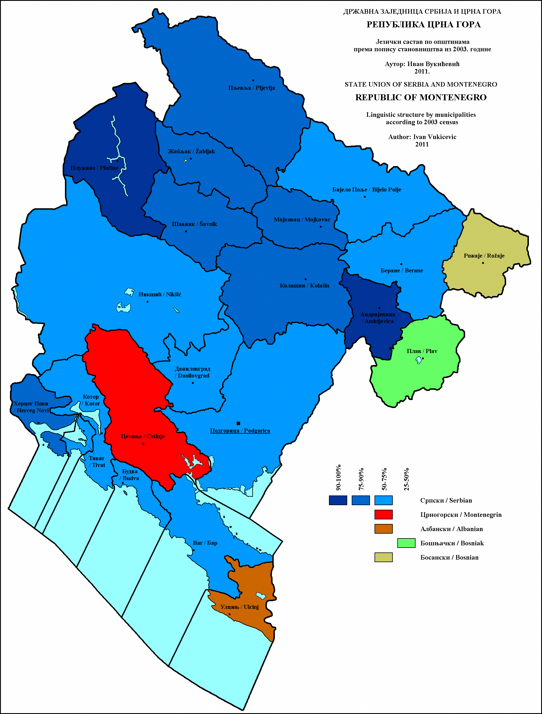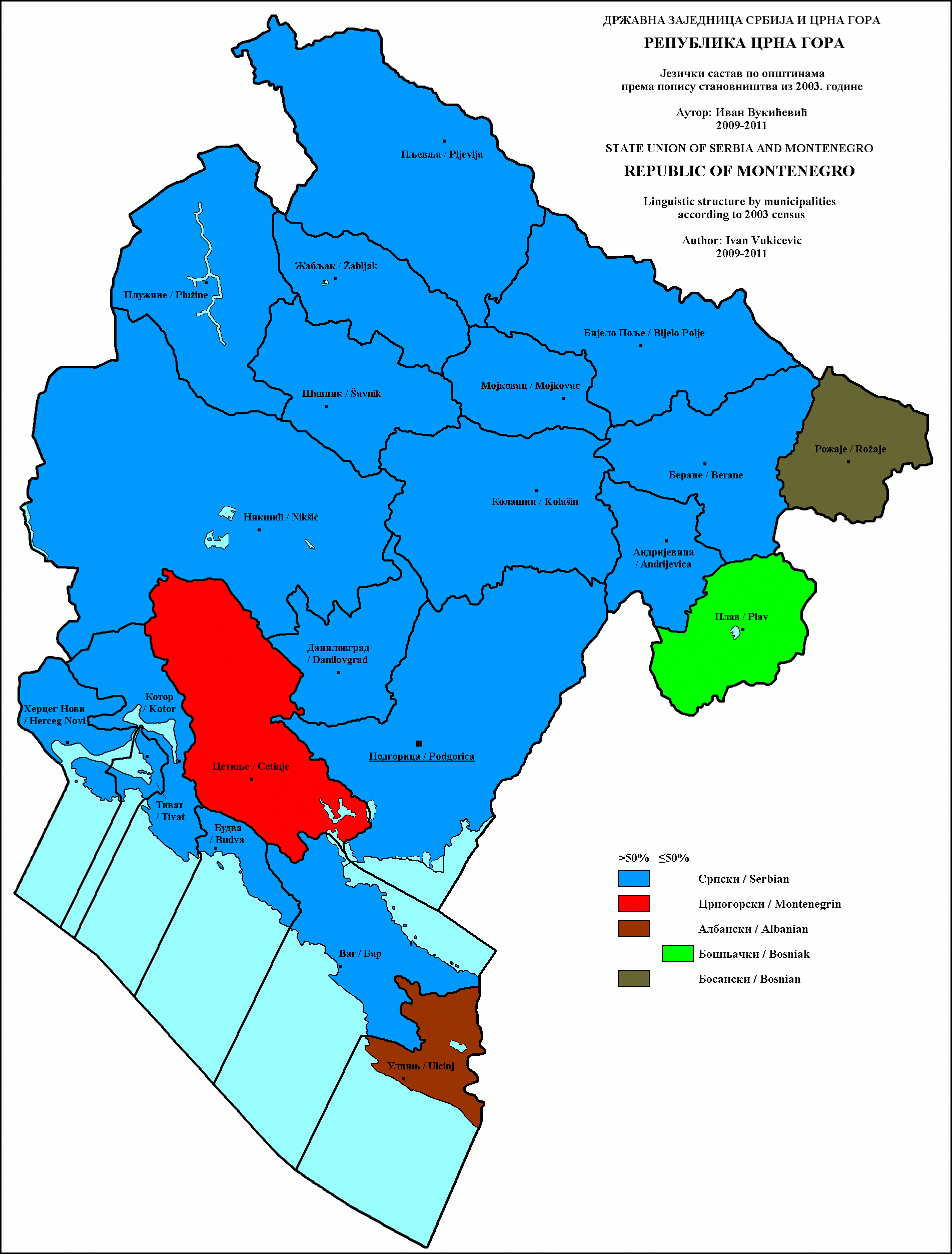 세르비아어를 사용하는 인구는 세르비아인(50.21%), 몬테네그린(39.71%), 무슬림(2.21%), 보스니아인(0.69%), 크로아티아인(0.64%) 등이다. 몬테네그로어를 사용하는 인구는 몬테네그린(78%), 무슬림(10%), 보스니아인(9.21%) 등이다. 알바니아어는 알바니아인(93.19%), 몬테네그린(2.38%) 등이 사용하며, 보스니아어는 보스니아인(93.75%), 무슬림(5.5%) 등이 사용한다. 크로아티아어는 크로아티아인(87.35%), 세르비아인(3.3%) 등이 사용한다.