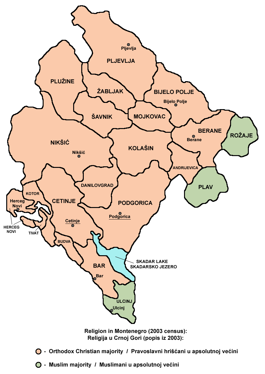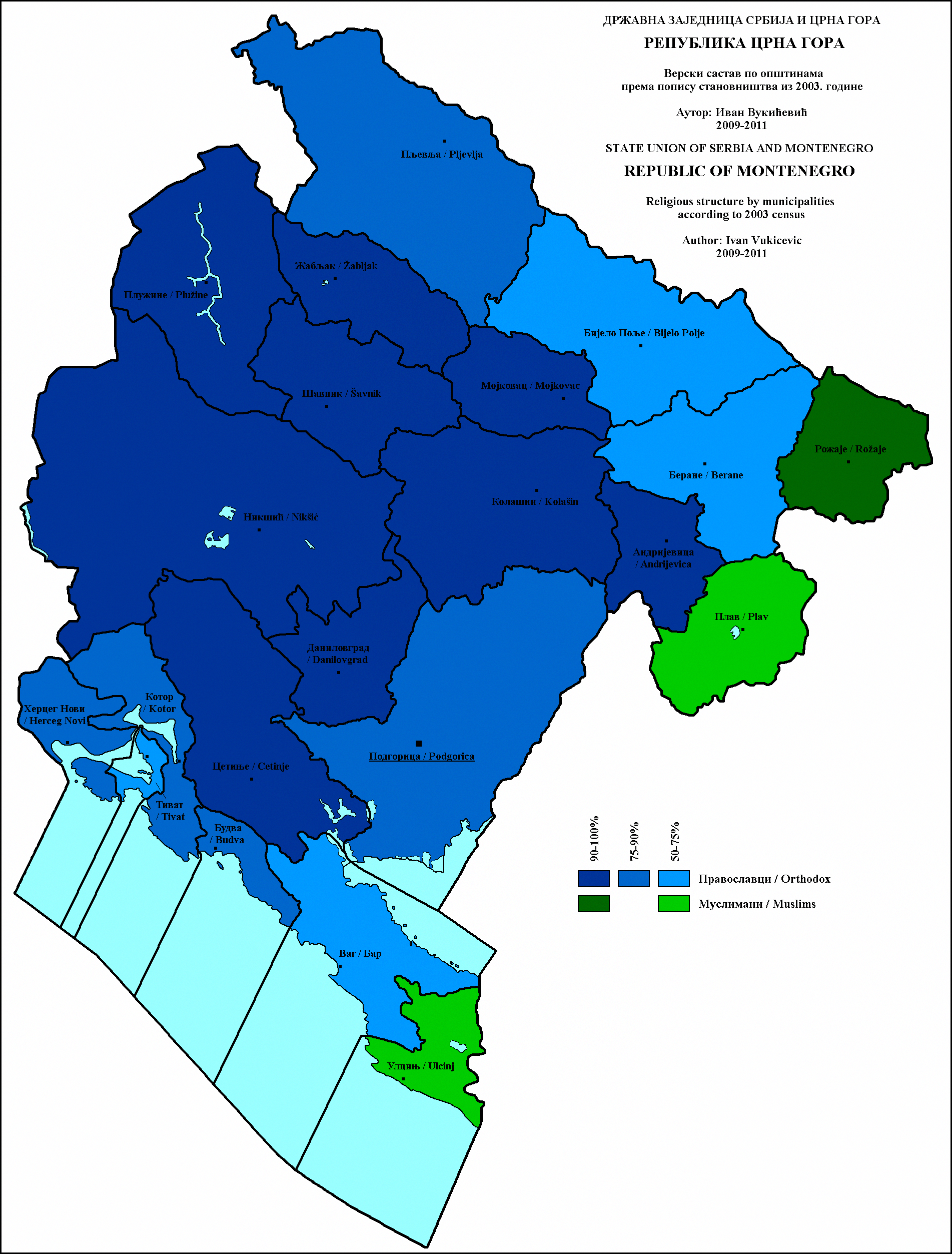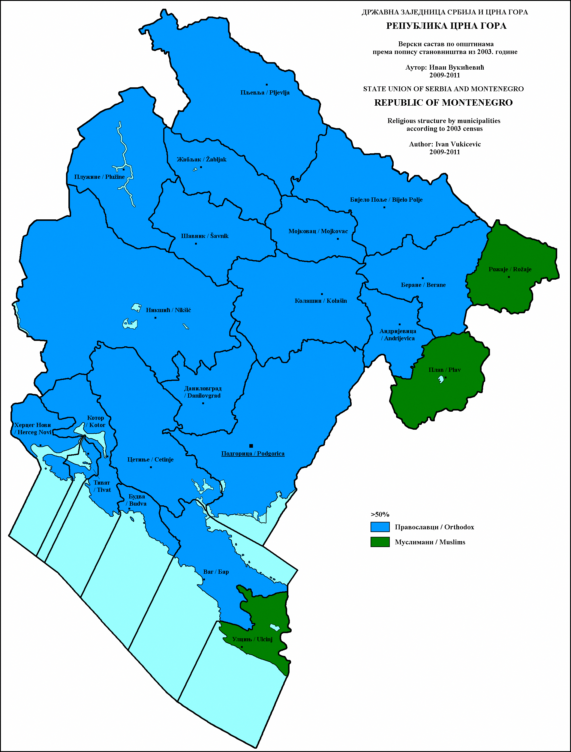 동방 정교회 신자 중에는 몬테네그로인이 241,728명(52.51%), 세르비아인이 196,333명(42.65%)으로 다수를 차지한다. 이슬람교 신자 중에는 보스니아인이 47,852명(43.49%), 무슬림이 24,111명(21.91%), 알바니아인이 22,834명(20.75%)이다. 로마 가톨릭 신자 중에는 알바니아인이 8,126명(36.98%), 크로아티아인이 6,262명(28.5%)으로 구성되어 있다.