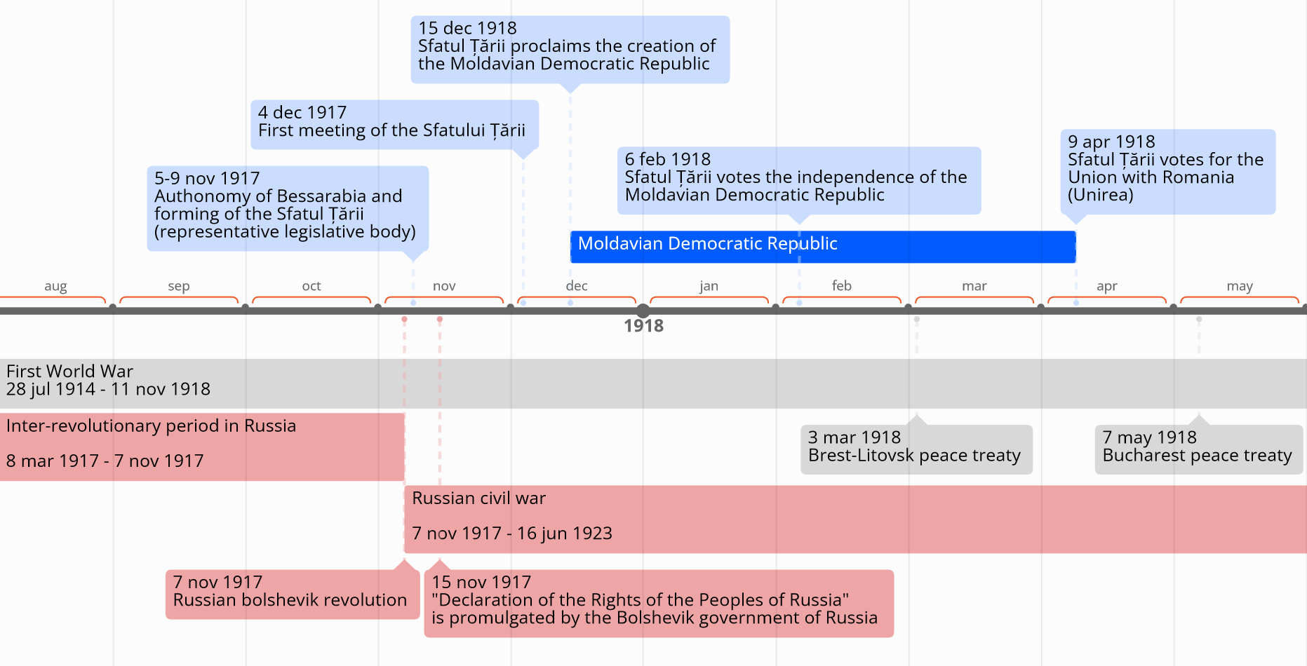 몰다비아 민주공화국의 역사는 러시아 제국 내 자치 시기, 독립 시기, 루마니아와의 연합 시기 등 세 시기로 구분된다. 1917년 12월 15일, 몰다비아 민주공화국은 러시아 연방 민주공화국의 구성국임을 선포했다.[18] 1918년 1월, 룸체로드의 볼셰비키 부대가 키시너우에 진입하자, 국가평의회의 민족주의 세력은 루마니아 왕국에 군사 원조를 요청했고, 루마니아군은 국경을 넘어 키시너우를 점령했다.[2] 루마니아군이 베사라비아를 완전히 통제하게 되면서, 국가평의회는 1918년 2월 5일 독립을 선포했다.[15]1918년 4월 9일, 국가평의회는 찬성 86표, 반대 3표, 기권 36표로 루마니아와의 조건부 통합을 결정했다.[20][21] 통합 조건에는 지방 자치와 입법부 (스파툴 차리이)의 존속이 포함되었다.[8][9] 그러나 1918년 12월 10일, 제1차 세계 대전이 끝난 후, 국민의회 의원들은 비밀리에 모여 이전 조건을 철회하고 루마니아와의 무조건적인 통합을 선언했다.[15] 이후 국민의회는 해산되었고, 루마니아와의 연방주의자들은 부쿠레슈티에 초대되었다.[16]