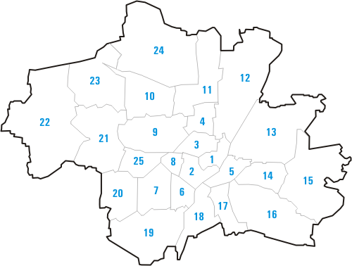| 자치구 | 알트슈타트-레헬 루드비히스포어슈타트-이사르포어슈타트 막스포어슈타트 슈바빙-베스트 아우-하이트하우젠 젠들링 젠들링-베스트파크 슈반탈러회헤 노이하우젠-님펜부르크 모자흐 밀베르츠호펜-암 하르트 슈바빙-프라이만 보겐하우젠 베르크 암 라임 트루더링-림 라머스도르프-페를라흐 오버기징 운터기징-하를라힝 탈키르헨-오버젠들링-포르스텐리트-퓌르스텐리트-졸른 하데른 파징-오버멘칭 아우빙-로흐하우젠-랑비트 알라흐-운터멘칭 펠트모칭-하젠베르글 라임 |