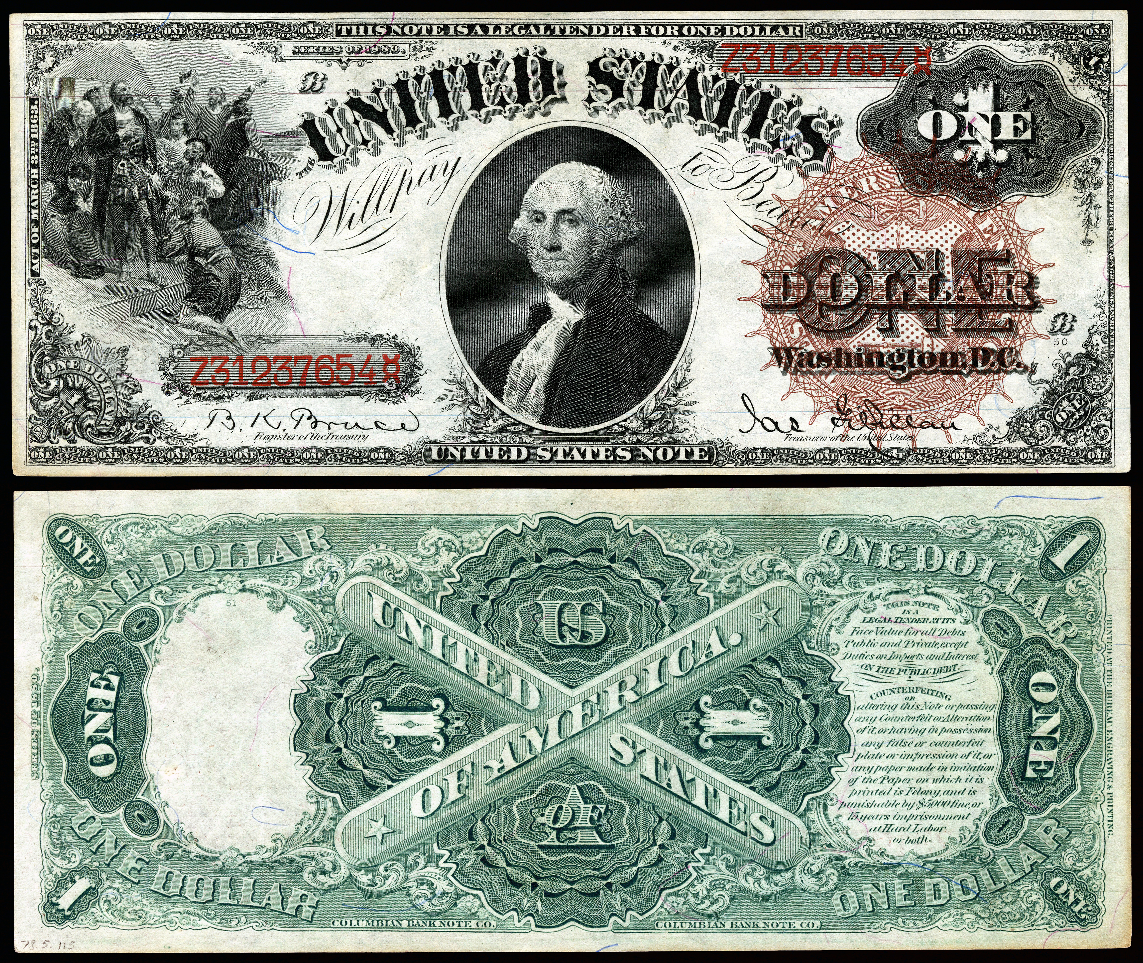 - 1869년: 1달러 미합중국 지폐는 중앙에 조지 워싱턴의 초상화와 왼쪽에 비네트 형식의 크리스토퍼 콜럼버스가 육지를 발견하는 모습으로 재디자인되었다. 지폐 앞면에는 매우 작은 녹색 글씨로 여러 번 "ONE"이라는 단어가 인쇄되었고, 종이에는 파란색 색조가 사용되었다.