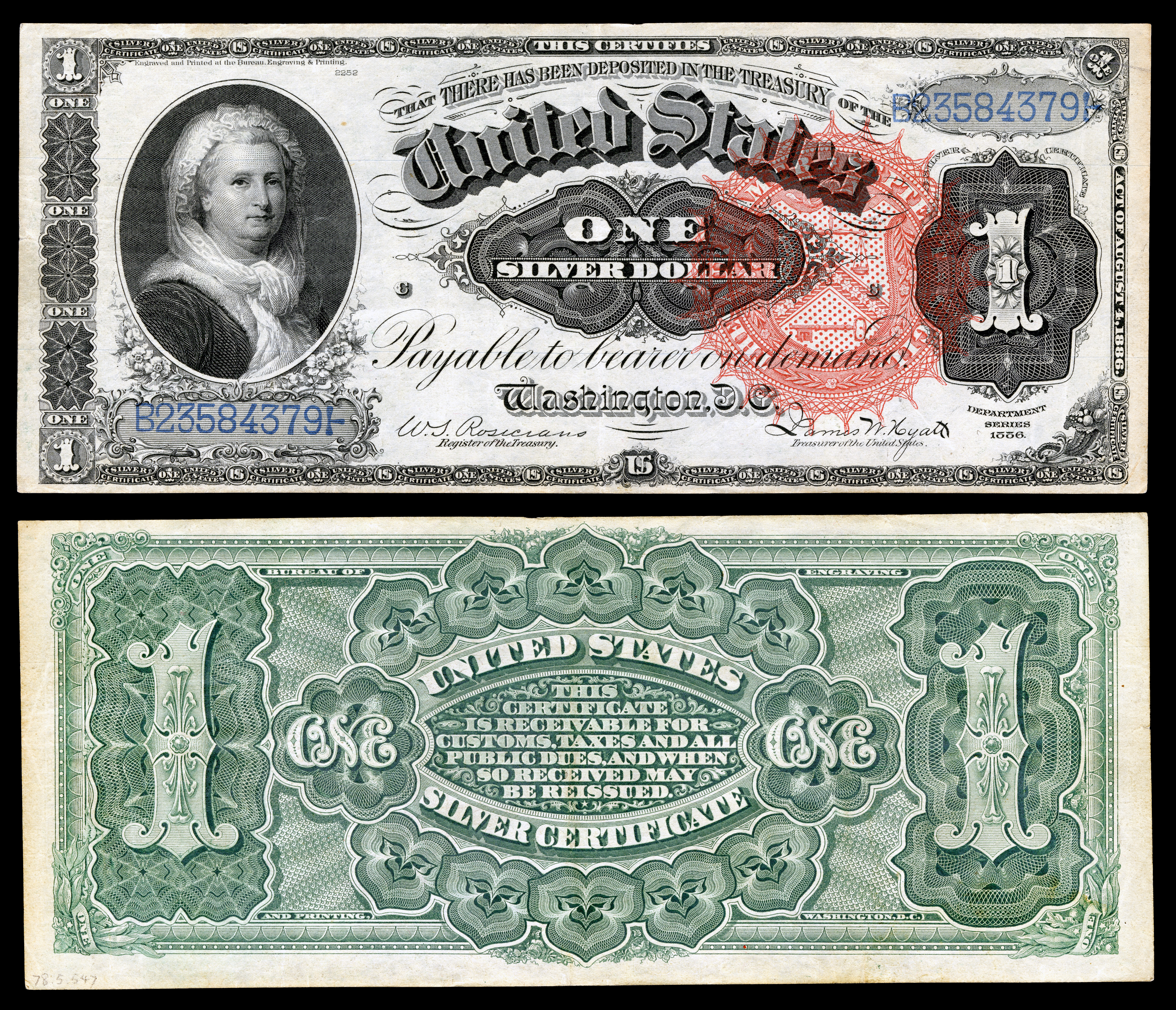 - 1886년: 미국 통화에 처음으로 등장한 여성인 마사 워싱턴이 1달러 은화증권에 등장했다. 지폐의 뒷면은 테두리를 제외한 지폐 전체를 차지하는 화려한 디자인이 특징이다.
