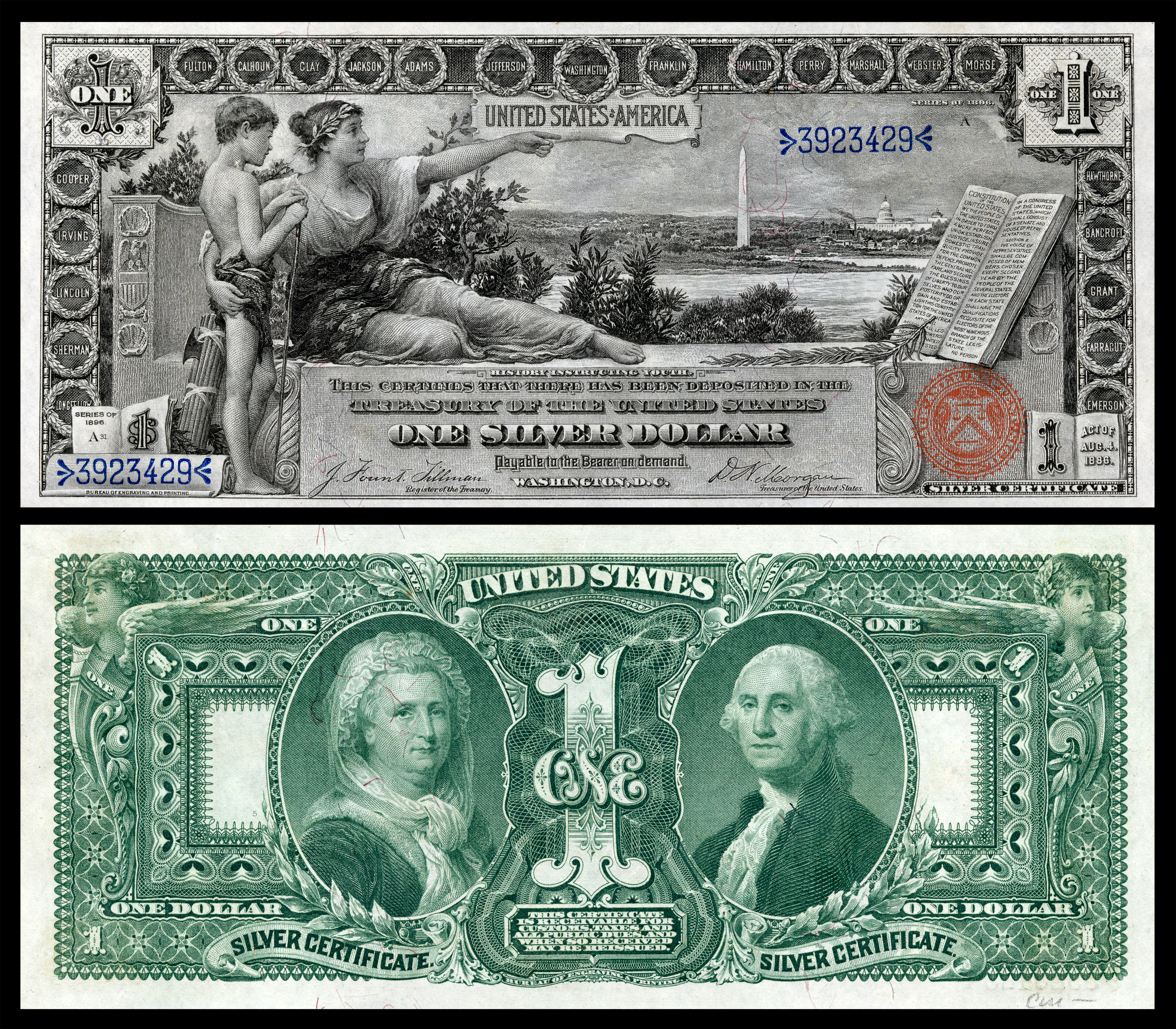 - 1896년: 유명한 "교육 시리즈" 은화증권이 발행되었다. 앞면 전체에는 워싱턴 D.C. 앞에서 "역사가 젊은이들을 가르치는" 것을 나타내는 의인화된 인물의 그림으로 덮여 있다. 뒷면에는 조지와 마사 워싱턴의 초상화가 거의 전체 지폐를 차지하는 화려한 디자인으로 둘러싸여 있다.