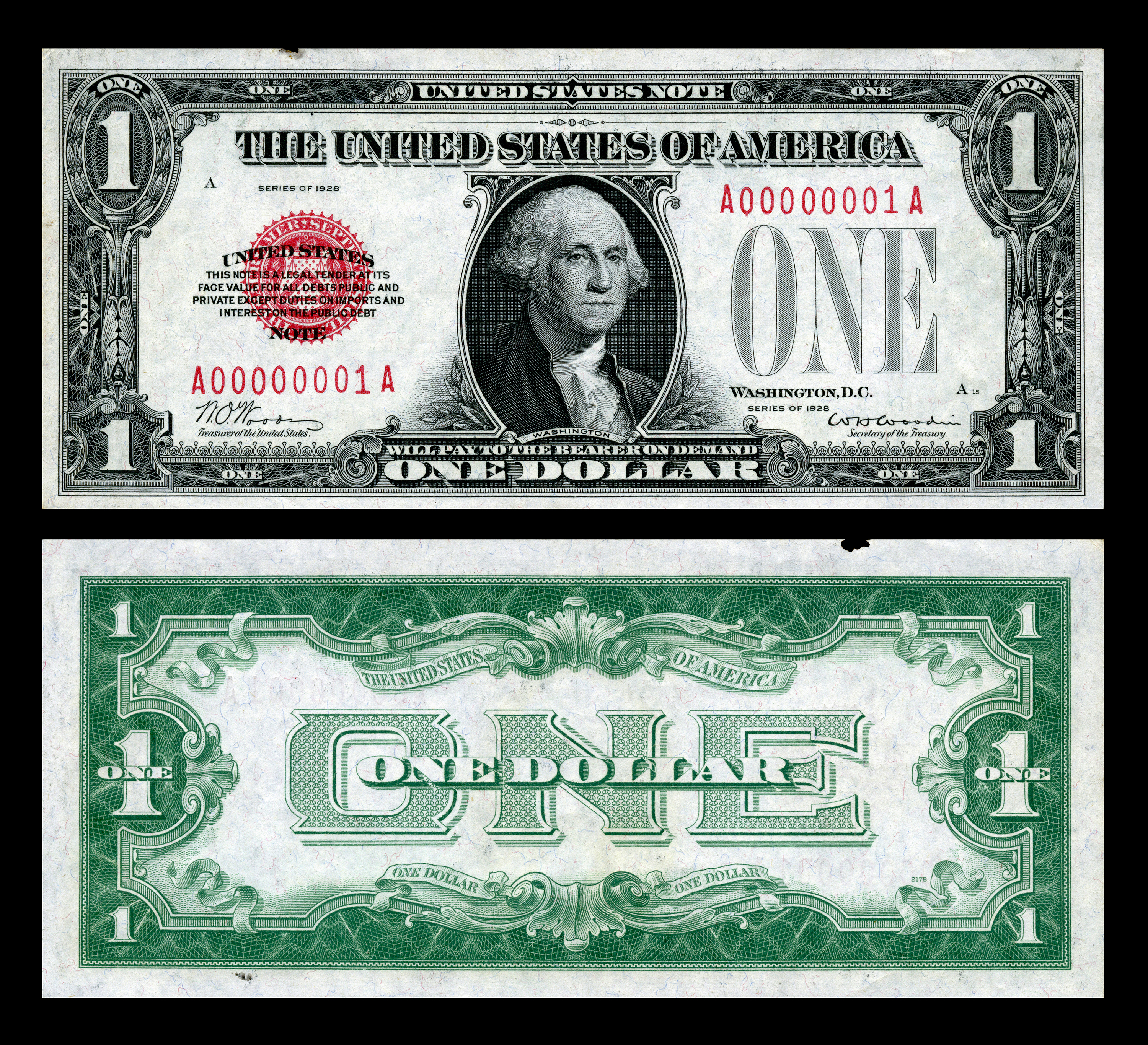 1933년, 1달러 은화증서 공급을 보충하기 위해 1928년 시리즈 1달러 미국 지폐가 발행되었다. 재무부 인장과 일련 번호는 빨간색이었고, 앞면 문구가 달랐다. 그러나 발행 한 달 후, 필요성이 없어 생산이 중단되었다. 소량의 1달러 지폐가 유통되었고 나머지는 1949년 푸에르토리코에서 발행될 때까지 재무부 금고에 보관되었다.[10]