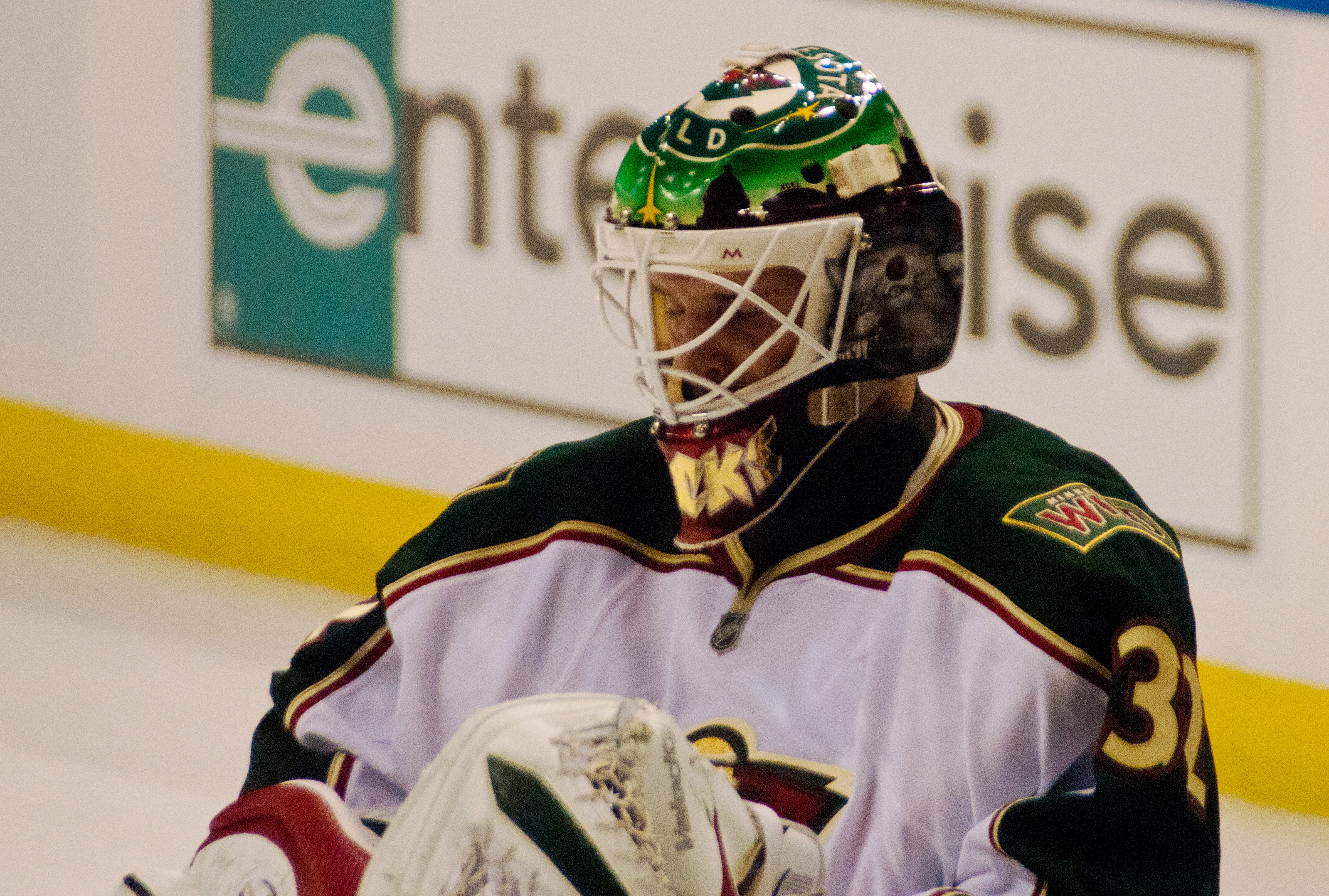 NHL 참가 후 7년 동안, 미네소타 와일드는 녹색 또는 흰색 저지에 빨간색과 금색 줄무늬가 있으며 저지 앞면에는 주 로고가 있는 유니폼을 착용했다. 어깨 패치는 "Minnesota Wild"가 독특한 글씨체로 적힌 원형이었다. 녹색 저지의 이름과 번호는 빨간색 윤곽선이 있는 금색이었고, 흰색 저지에서는 금색 윤곽선이 있는 빨간색이었다. 2003-04 시즌에 NHL이 홈과 원정 저지 색상 규칙을 바꾸면서 녹색 저지는 홈 저지가 되고 흰색 저지는 원정 저지가 되었다.3. 1. 2. 2007-2017