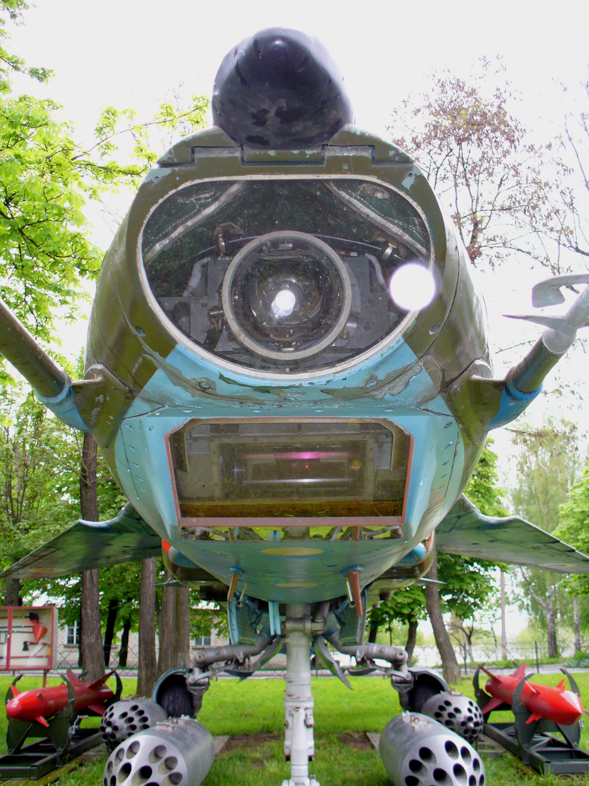 레이저-텔레비전 조준 시스템 Kayra-23 MiG-27K의 광학 창(kayra [кайра]는 러시아어로 바다 제비를 의미). 레이저 거리 측정기-레이저 지시기가 있는 TV 채널 아래 상자, 레이저 거리 측정기용 상단 수신기
