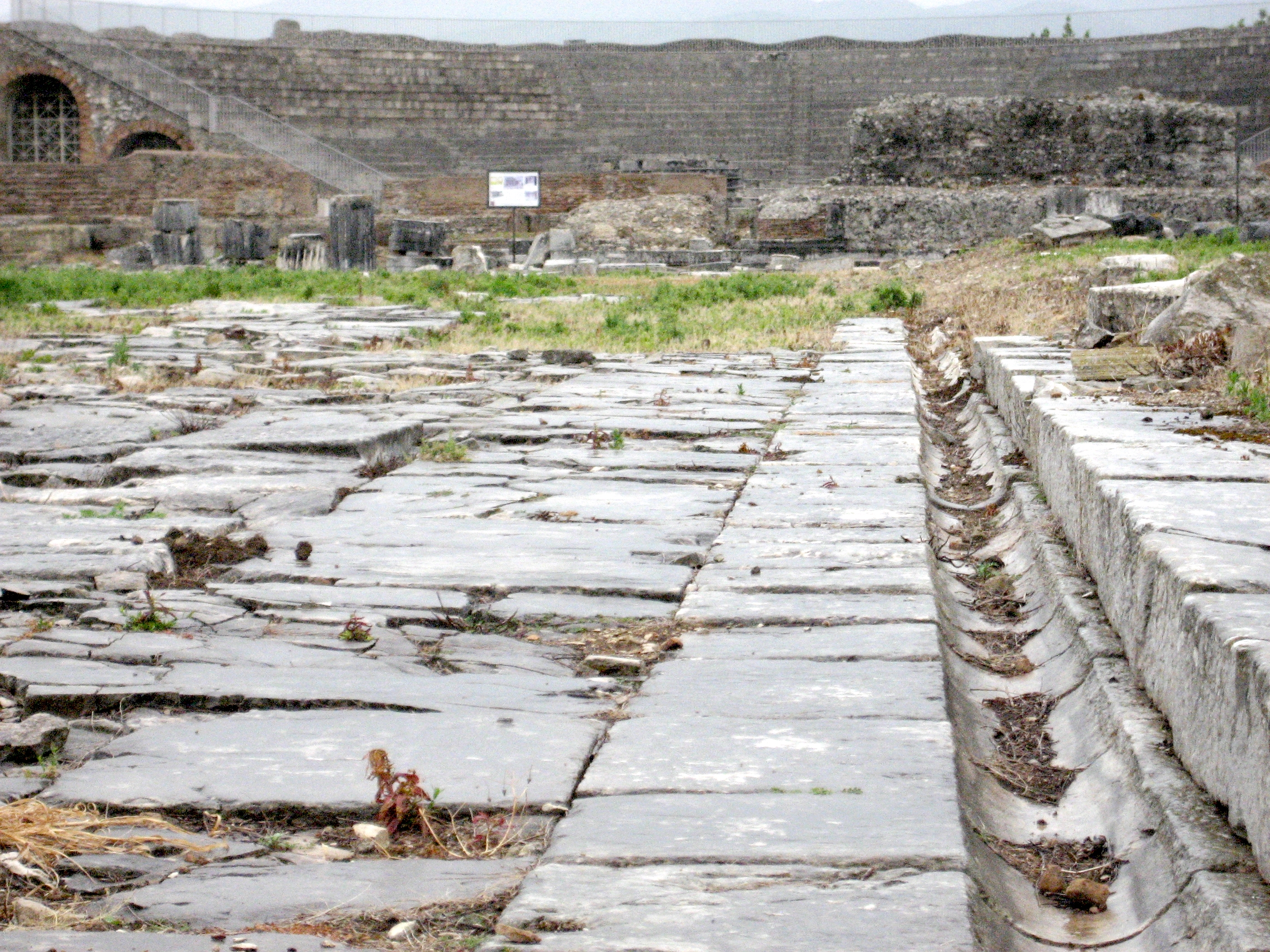 - 도시 중심부를 관통하는 기념 열주가 있는 아피아 가도(Appian Way)는 데쿠마누스 막시무스(decumanus maximus)이다.
