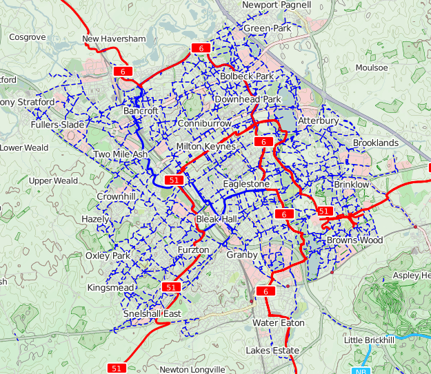 밀턴킨스의 자전거도로 네트워크. 국토 사이클 경로는 빨간색으로 강조 표시됩니다.