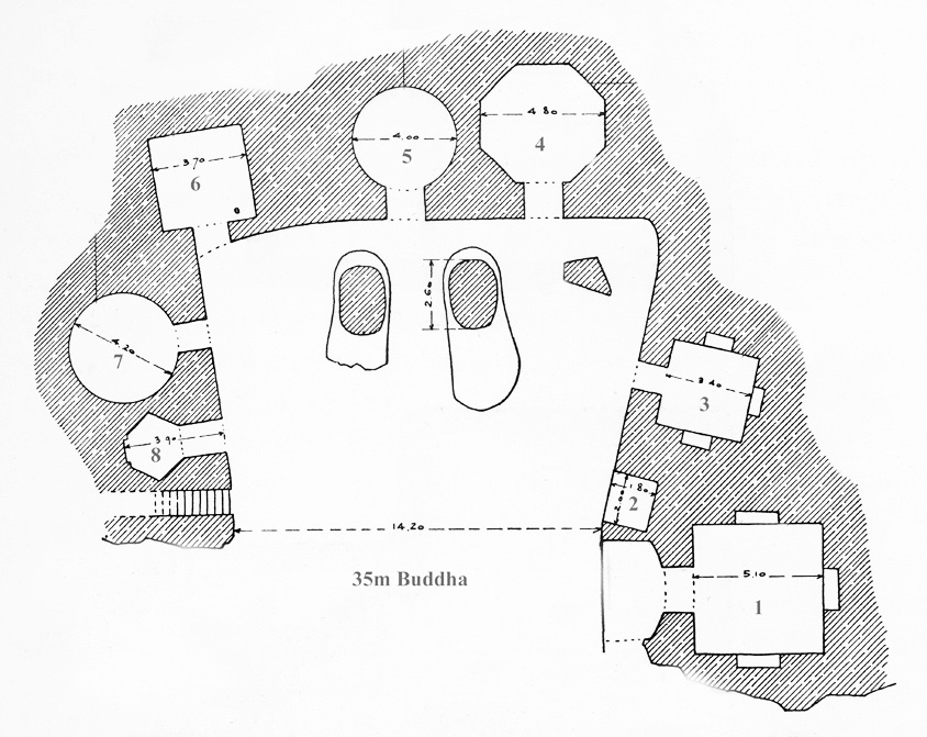 55미터 높이의 서쪽 불상 주변 천장과 측면에는 몇몇 벽화가 남아 있다. 많은 벽화들은 전통적인 불교적 특징을 보인다. 후대의 벽화 중 일부는 겹깃(double-lapel) 카프탄(caftan)을 입은 남성 신자들을 보여준다.[42]3. 3. 인접 석굴