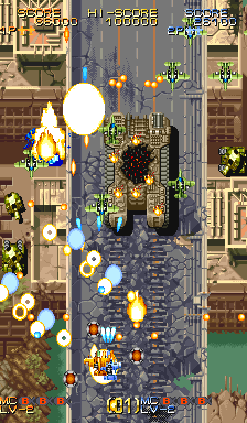 자신의 기체에서 발사되는 메인 샷은 총 3종류가 있다. 같은 종류의 샷 아이템이나 파워업 아이템(POW)을 획득하면 샷의 위력이 강해지며, 최대 8단계까지 파워업할 수 있다. 최고 단계에서 파워업 아이템을 추가로 얻으면 5000점의 보너스 점수를 받는다. 또한, 스테이지 진행 상황에 따라 기체가 파괴된 후 다시 시작할 때 보유하게 되는 파워업 단계가 달라진다.