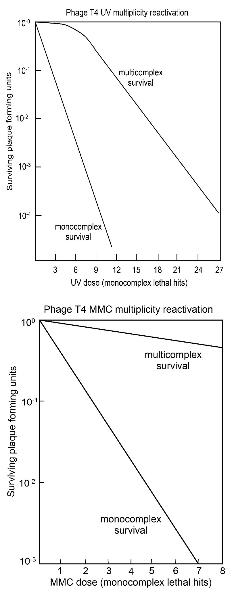 위의 그림은 자외선 조사가 증가함에 따라 바이러스 T4 다중 복합체 및 단일 복합체의 생존 곡선을 보여준다. 다중 복합체의 생존율이 단일 복합체의 생존율을 매우 큰 요인으로 초과한다. 다중 복합체에 대한 자외선 불활성화 곡선은 초기 어깨를 가지고 있는데, 이는 두 개의 재조합 과정이 사용됨을 의미한다.[36] 첫 번째 과정은 DNA를 효율적으로 복구하지만, 손상이 증가하면 그 능력이 포화된다. 두 번째 과정은 모든 수준의 손상에서 작동한다. 다중 복합체에서 방출된 생존 T4 바이러스는 돌연변이의 증가를 보이지 않아, 자외선 조사된 바이러스의 MR이 정확한 과정임을 나타낸다.[36]