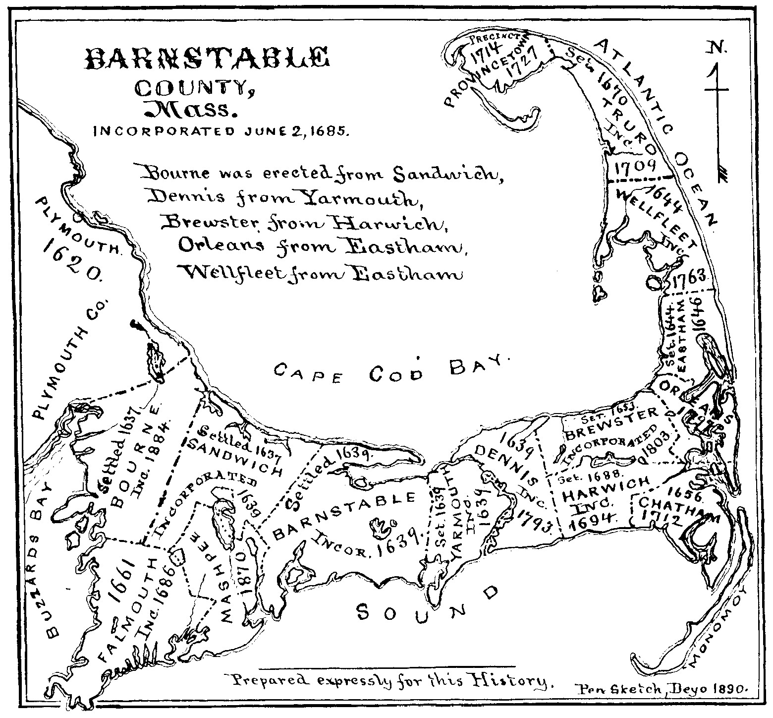 반스터블 군은 케이프 코드와 완전히 일치하지 않는다. 케이프 코드는 그 섬과 반도로 정의되는 지명이다. 프리먼에 따르면 "길고 불규칙한 모양의 반도"이며 북쪽 해안 또는 남쪽 해안을 따라 측정하면 105km에서 121km 사이이며 폭은 8km에서 32km이다. 처음에는 그 끝 부분만 곶이라고 지적했지만, 사람이 들어가면서 그 이름은 끝에서 지협을 가로지르는 최단선까지 확장되었다[37]。한편 반스터블 군은 지명이며 법률 용어이다. 매사추세츠 주 의회에 의해 군 내에 정의된 도시와 마을의 영역 모두를 포함하고 있다. 이들 영역은 플리머스 식민지 설립 이래 오랫동안 논의되어 온 많은 에피소드가 있는 곳에 있다[38]
