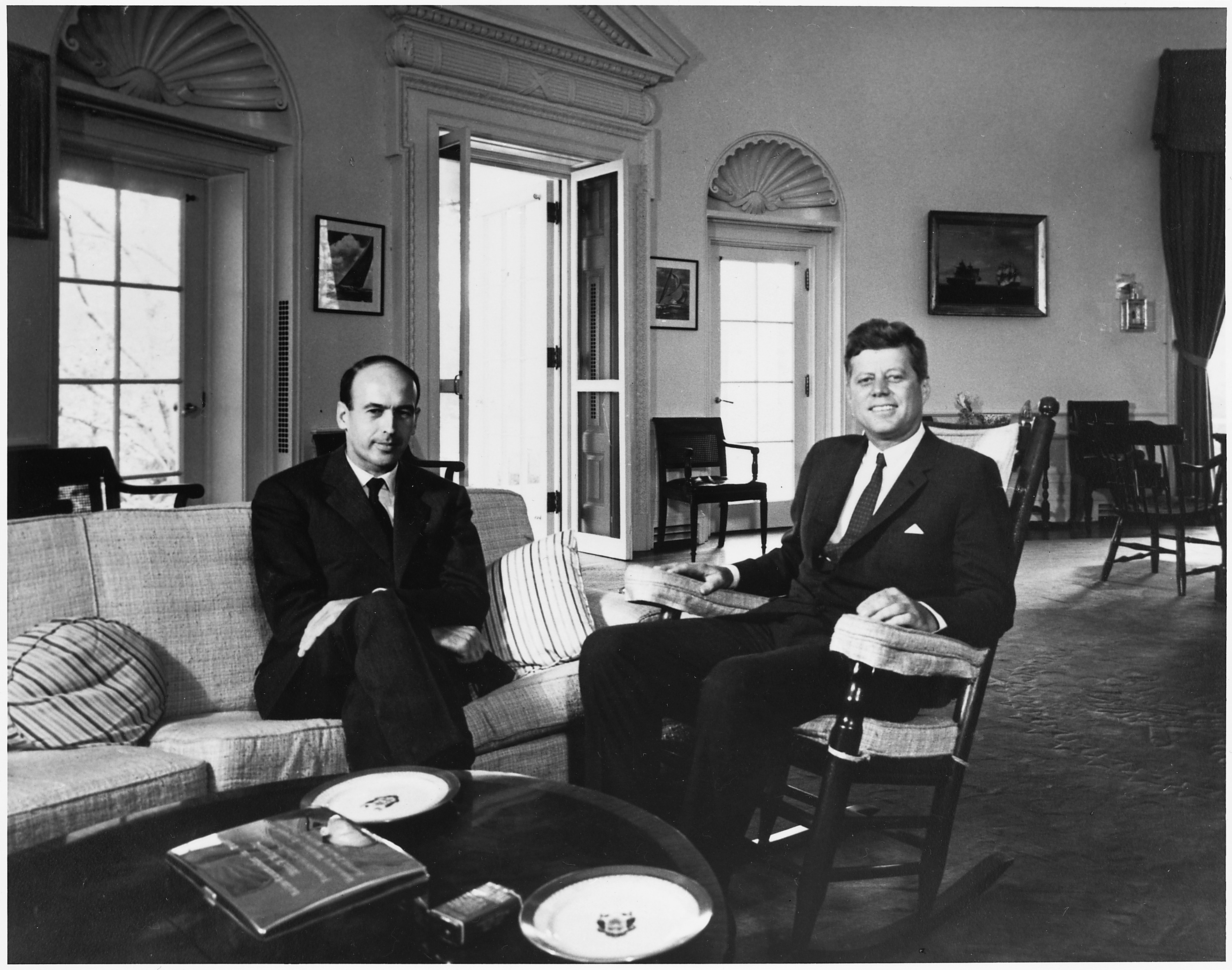 조르주 퐁피두 대통령이 1974년 갑작스럽게 사망하면서 치러진 대통령 선거에서 프랑스 사회당의 프랑수아 미테랑과 격돌했다. 1차 투표에서는 미테랑에게 뒤졌으나, 2차 투표에서 근소한 차이로 승리하여 대통령에 당선되었다.[14] 당시 48세로, 루이 나폴레옹 보나파르트와 장 카시미르페리에에 이어 프랑스 역사상 세 번째로 젊은 대통령이었다.[14]재임 중 유럽 경제공동체(EEC)를 강화하여 유럽 연합(EU)으로 발전하는 데 초석을 다졌으며, 선진국 정상 회의(G7) 창설에도 주도적인 역할을 했다.