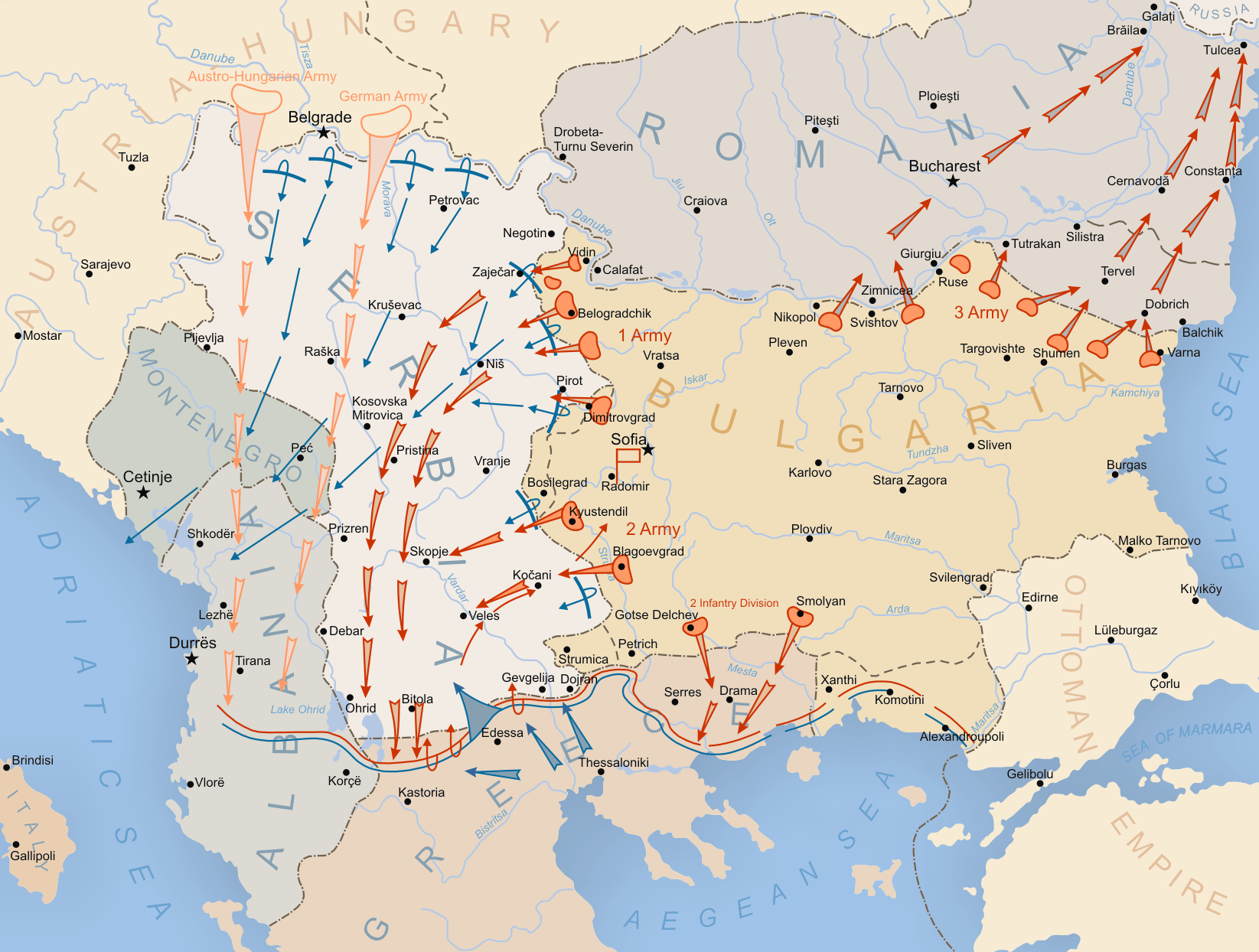 발칸 전쟁 이후, 불가리아 여론은 러시아와 서방 열강에 대해 반감을 품게 되었다. 불가리아인들은 그들이 아무런 도움도 받지 못했다고 느꼈기 때문이다. 러시아는 불가리아가 제2차 발칸 전쟁을 일으킨 것에 대해 비난하며, 세르비아를 더욱 신뢰할 수 있는 슬라브 동맹국으로 여겼다. 불가리아 정부는 독일과 오스트리아-헝가리와 동맹을 맺었는데, 이는 불가리아의 전통적인 숙적이었던 오스만 제국과도 동맹을 맺는 것을 의미했다. 불가리아는 더 이상 오스만 제국에 대한 영토 주장을 할 수 없었지만, 세르비아, 그리스, 루마니아는 여전히 불가리아인들이 불가리아 땅으로 여기는 영토를 점유하고 있었다.발칸 전쟁으로 회복 중이던 불가리아는 제1차 세계 대전 첫 해 동안 중립을 지켰다. 독일이 불가리아에 세르비아 마케도니아 전역, 세르비아 북동부 일부, 그리고 의 새로운 차관을 약속하자,[1] 불가리아는 1915년 10월 세르비아에 선전포고했다. 그러자 영국, 프랑스, 이탈리아는 불가리아에 선전포고했다.[1]