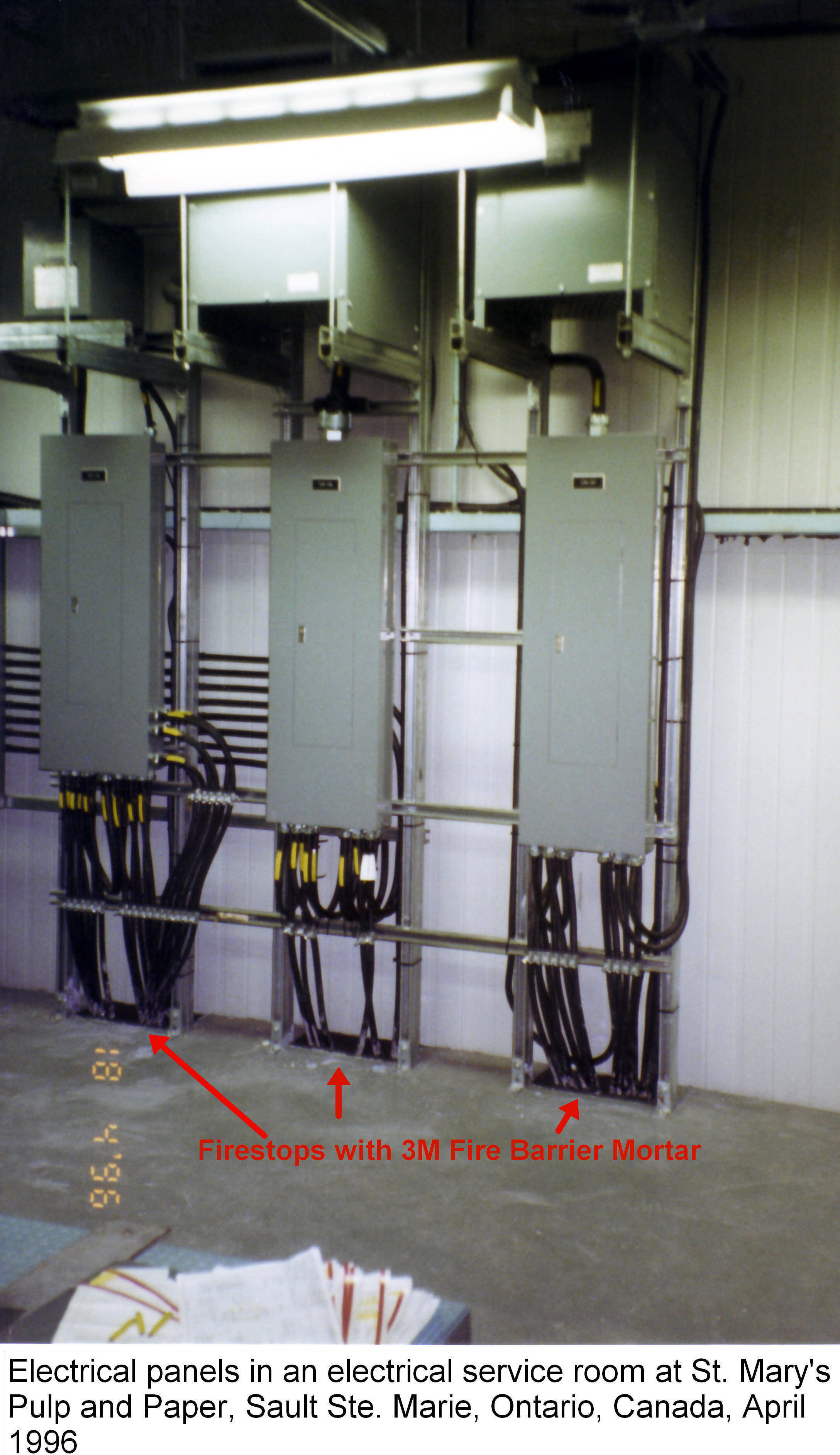 배선 또는 배선을 담는 전선관이 내화 등급 벽과 바닥을 가로질러야 하는 경우, 개구부는 지역 건축 법규에 따라 방화 댐퍼 처리를 해야 한다. 사고로 인한 화재 발생 시 안전에 중요한 배선을 작동 상태로 유지해야 하는 경우, 회로 무결성을 유지하기 위해 방화를 적용하여 제품의 인증 목록을 준수해야 한다. 배선 및 전선관과 함께 사용되는 모든 수동 방화 보호 재료의 특성과 두께는 전선 허용 전류 감소에 정량적인 영향을 미친다. 이는 내화에 필요한 단열재 특성이 전력 도체의 공기 냉각을 억제하기 때문이다.[16]