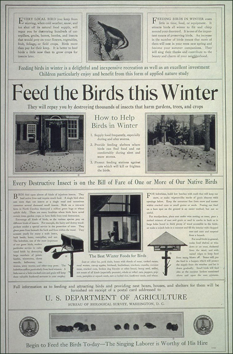 영국에서는 1890년에서 1891년에 걸친 혹독한 겨울 동안 전국 신문에서 사람들에게 새에게 먹이를 주도록 요청하는 캠페인이 벌어졌다. 이후 1910년, 영국의 유명 잡지인 펀치는 새에게 먹이를 주는 것이 영국의 전국적인 유행이자 취미가 되었다고 선언했다.[2]미국에서는 조류 먹이주기가 대중적인 취미로 자리 잡았으며, 이를 기념하기 위해 1994년 의회 법령에 따라 매년 2월을 전국 조류 먹이주기 달로 지정하였다.[5]