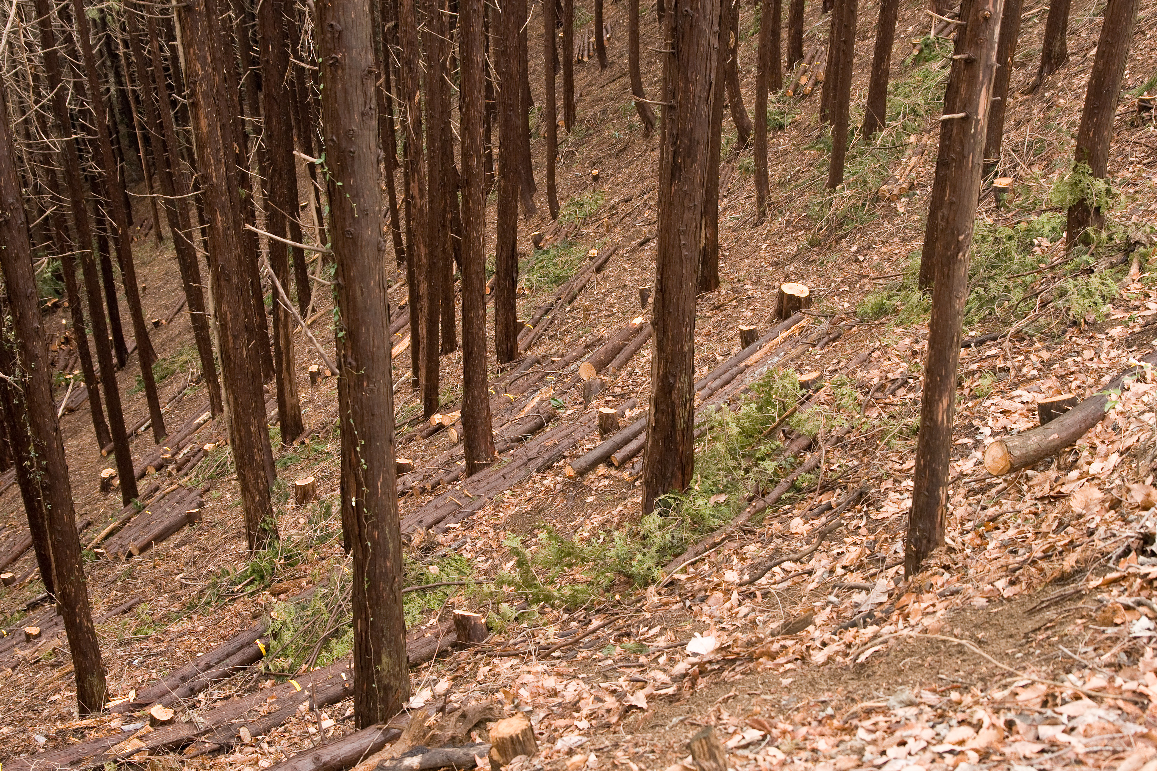 일본에서는 쇼와 중기까지 조림 시 벌채는 산등성이를 크게 남기는 방식이었으며, 개벌이라 하더라도 산허리 전체를 벌거벗기는 식의 시행은 하지 않았던 것으로 보인다.