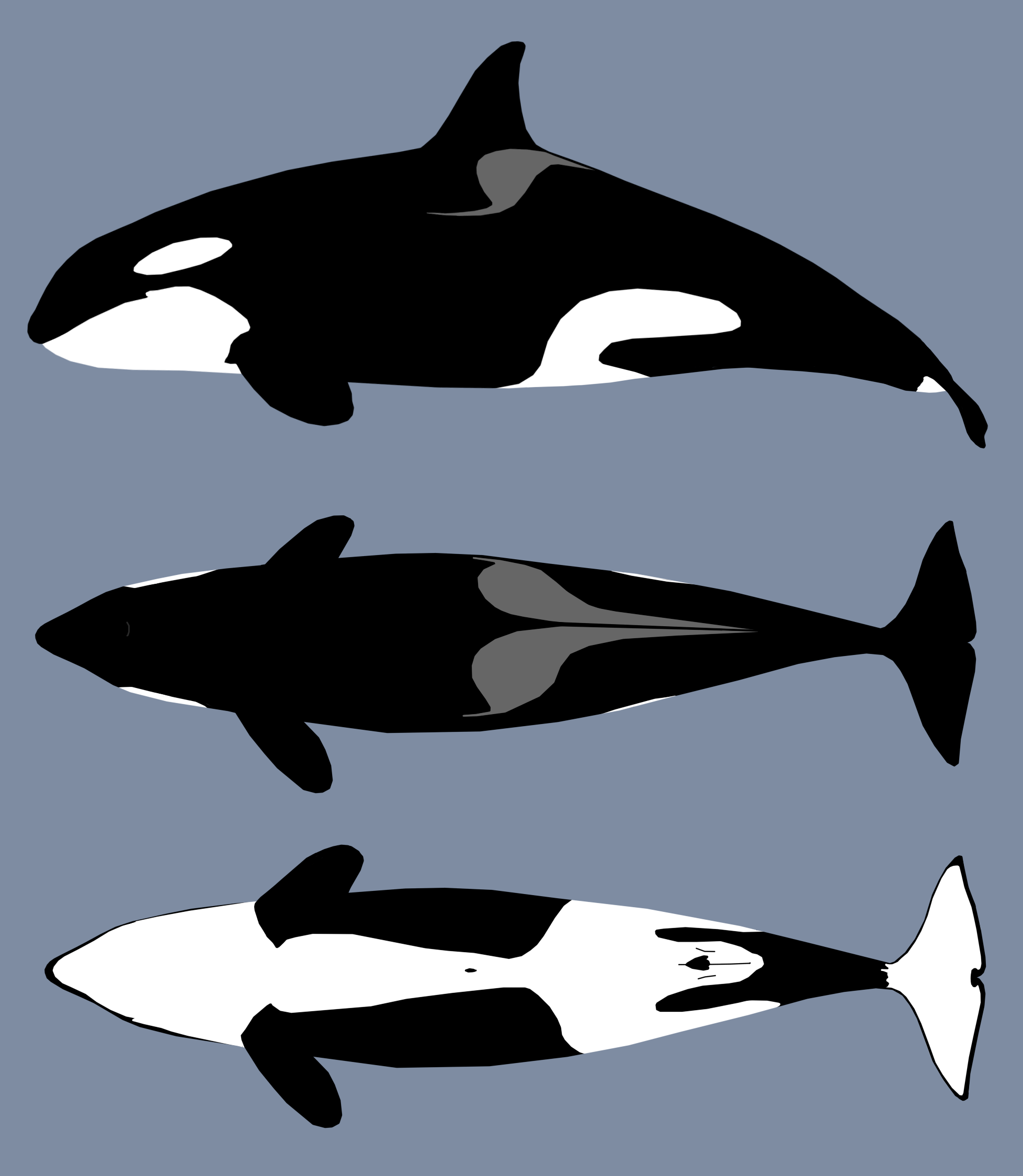 B형과 C형 범고래는 주로 빙산 가까이에 살며, 물속 규조류 때문에 노란색으로 착색되어 보일 수 있다. 미토콘드리아 DNA 염기서열은 이들이 최근에 분리된 별개의 종이라는 이론을 뒷받침한다.[260][261]