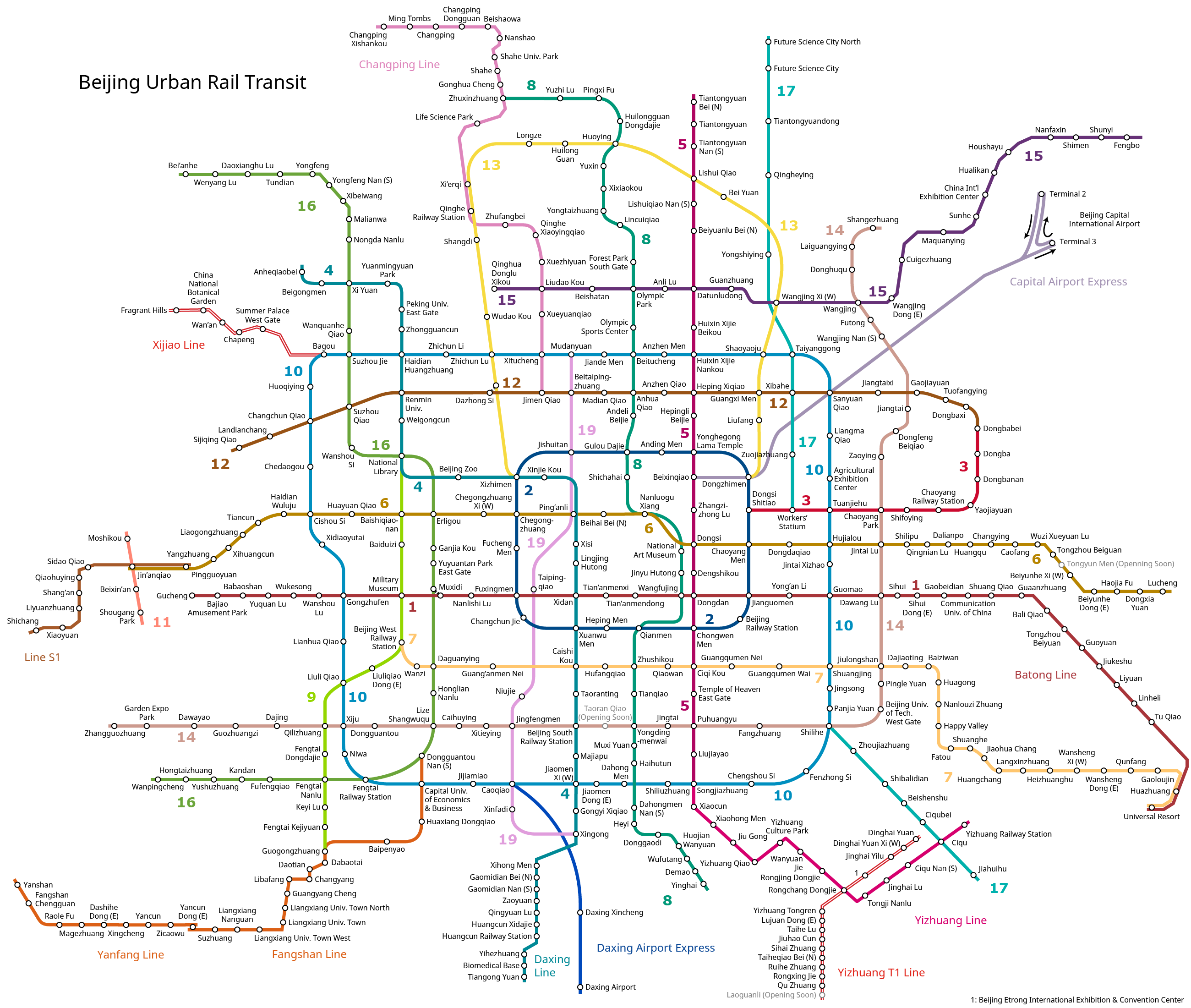 - 2019년: 9월 26일, 다싱 공항선 1단계(차오차오역-다싱 공항역)가 베이징 다싱 국제공항 개항에 맞춰 개통되었다.[137] 12월 28일, 7호선 동부 연장(자오화창역-화좡역)과 바퉁선 남부 연장(투차오역-화좡역)이 개통되었다.[138] 2단계 건설 계획에 11호선(2022년 동계 올림픽 지선)과 13호선 분할 프로젝트가 추가되었다.[36]