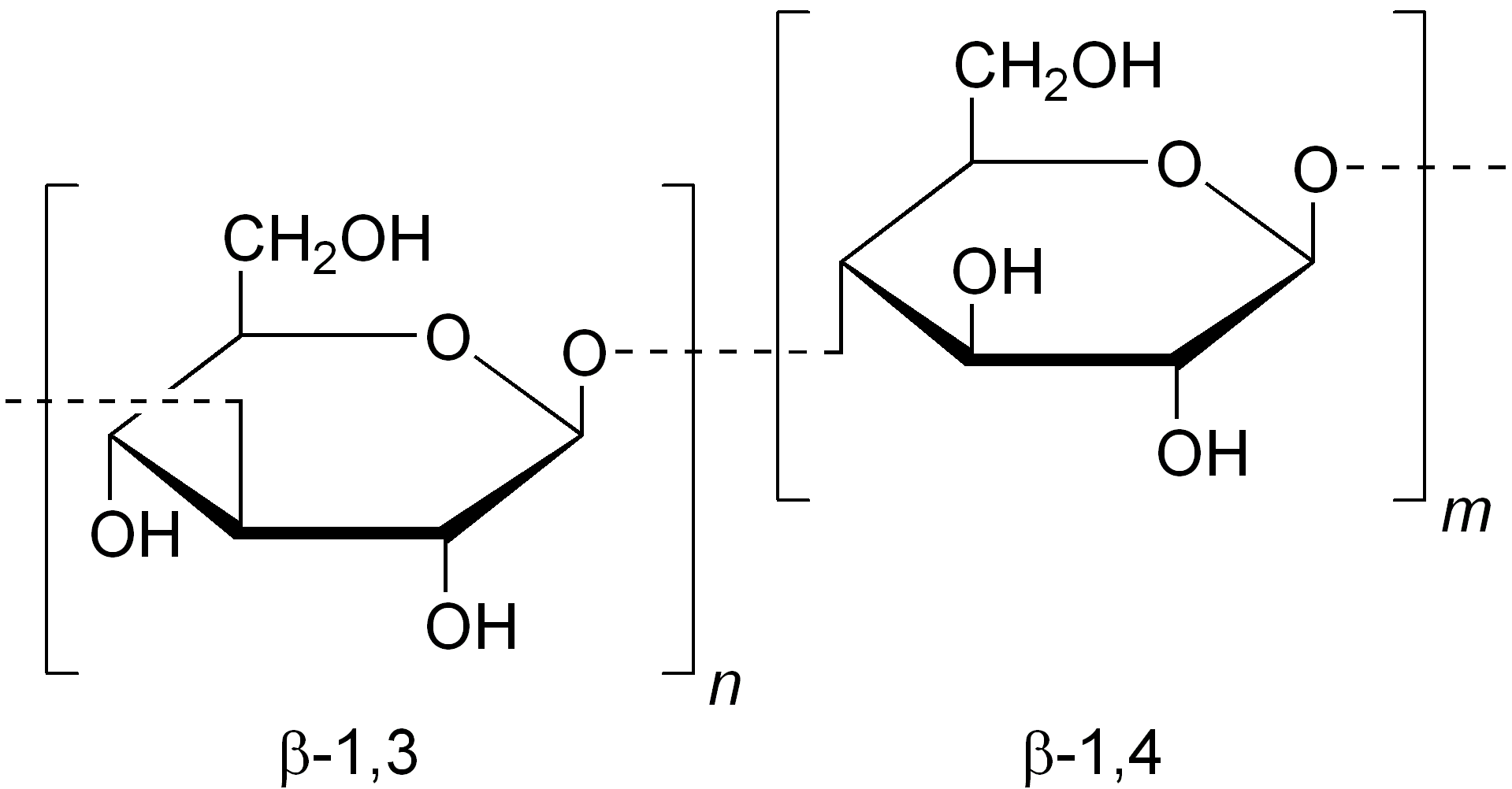 β-글루칸의 가장 일반적인 형태는 β-1,3 연결을 가진 D-글루코스 단위로 구성된 것이다. 효모 및 진균 β-글루칸은 1-6개의 측쇄를 포함하는 반면, 곡물 β-글루칸은 β-1,3 및 β-1,4 골격 결합을 모두 포함하지만 β-1,3 분기는 없다.[6] 해조류는 주로 β-1,3-글루칸으로 구성된 골격을 가지며, 골격뿐만 아니라 측쇄에도 약간의 β-1,6-글루칸을 포함한다.[6]