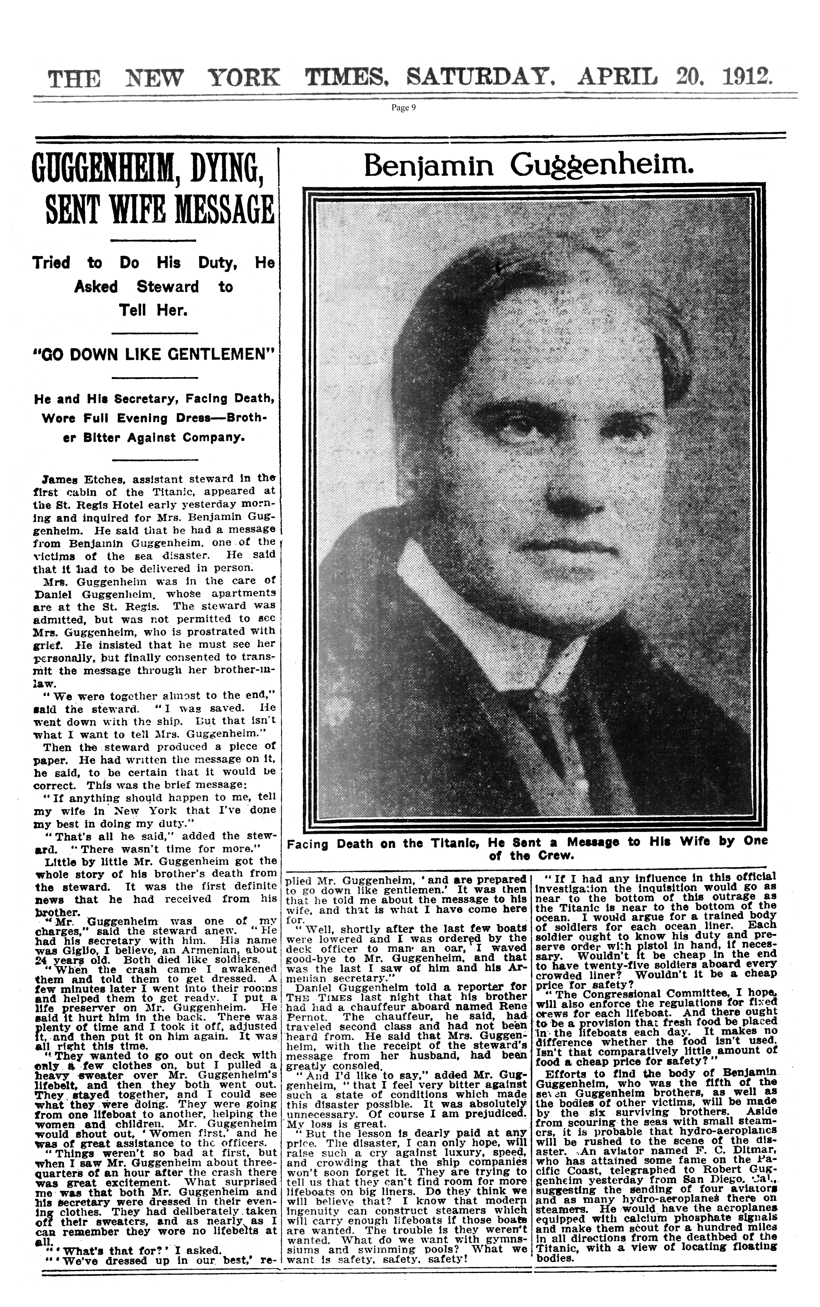 상황이 절망적임을 깨달은 구겐하임과 지글리오는 입고 있던 구명조끼와 스웨터를 벗고 가장 좋은 옷인 연미복으로 갈아입었다. 구겐하임은 스튜어드 에체스에게 "우리는 최고의 옷을 입었고 신사답게 죽음을 맞이할 준비가 되었습니다"라고 말했다.[11][29] 그는 에체스에게 아내에게 전할 메시지를 남겼다. "만약 나에게 무슨 일이 생긴다면, 뉴욕에 있는 아내에게 내가 내 의무를 다하기 위해 최선을 다했다고 전해주시오."[11][30] 다른 스튜어드의 증언에 따르면, 그는 "내가 끝까지 정정당당하게 싸웠고, 벤 구겐하임이 겁쟁이였기 때문에 이 배에 여자는 한 명도 남지 않았다라고 전해 주세요. 내 마지막 생각은 당신과 우리 딸들에 대한 것이 될 것입니다"라는 말도 남겼다고 한다.