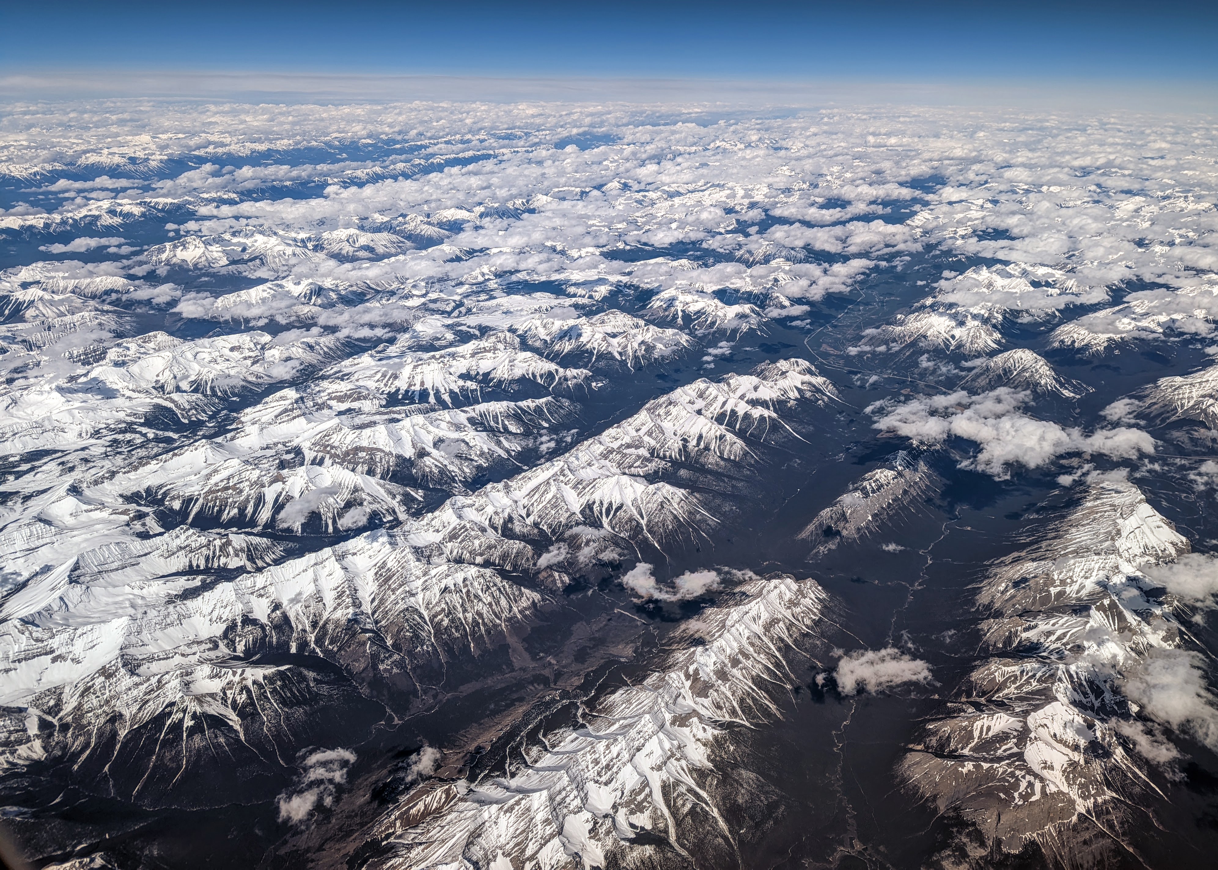 Mountains around Banff, with Spray River flowing north to the Bow River at Banff (a small cloud obscures Banff itself)