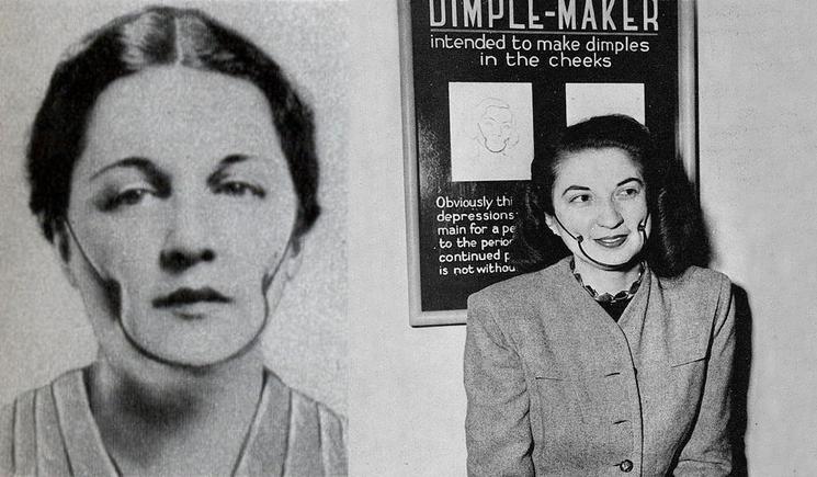 20세기 초, 오하이오에 본사를 둔 Dolly Dimpler 회사는 고객의 볼에 보조개를 만드는 장치 광고를 게재했다.[35] 1936년 이사벨라 길버트는 보조개를 흉내 내는 Dimple Maker를 발명했지만,[36] 인공 보조개가 지속될 수 있는지는 알려지지 않았다.[37]