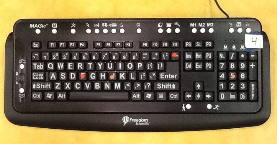 대형 문자 키보드는 키에 큰 글자가 인쇄되어 있다. 표시된 키보드의 상단에 있는 둥근 버튼은 화면을 확대(확대/축소)하거나, 화면의 배경색을 변경하거나, 화면의 마우스 커서를 더 크게 만들 수 있는 소프트웨어를 제어한다. 이 경우 키보드를 사용하는 기관에서 설치한 키의 "돌기 점"은 사용자가 촉각으로 올바른 키를 찾는 데 도움이 된다.