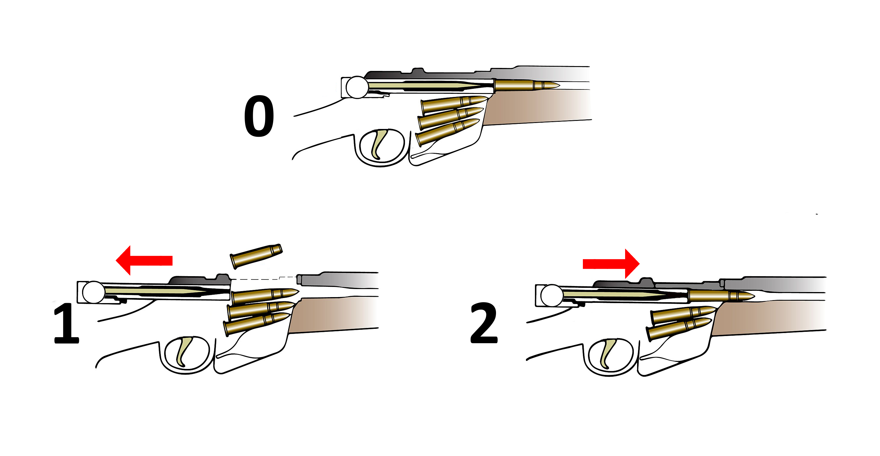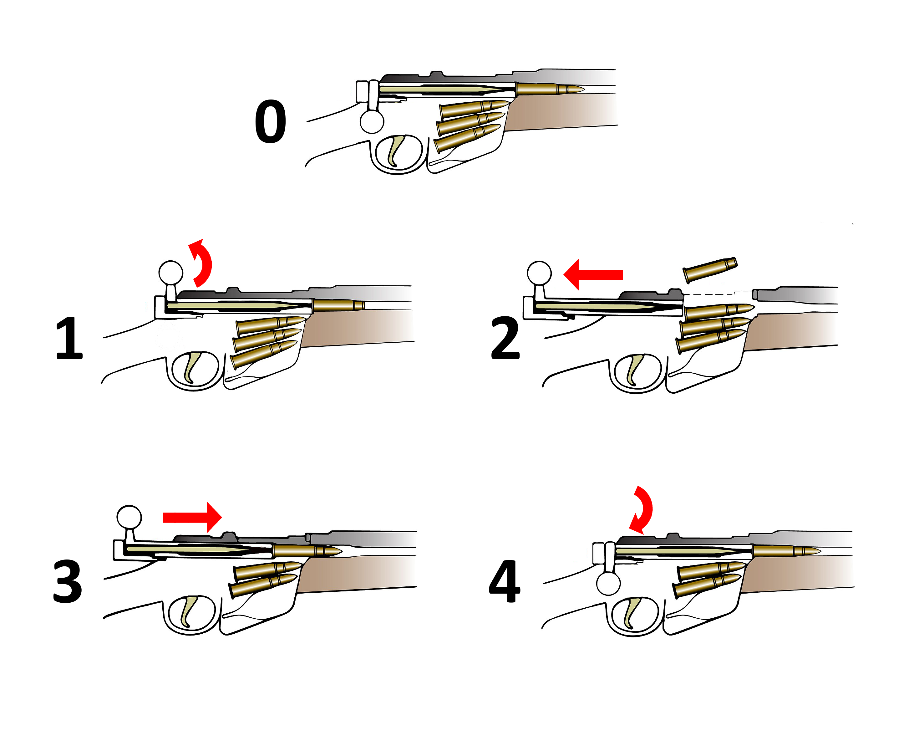 장전 과정볼트를 들어 올리고 뒤로 당겨 탄피 배출 및 다음 탄약 장전