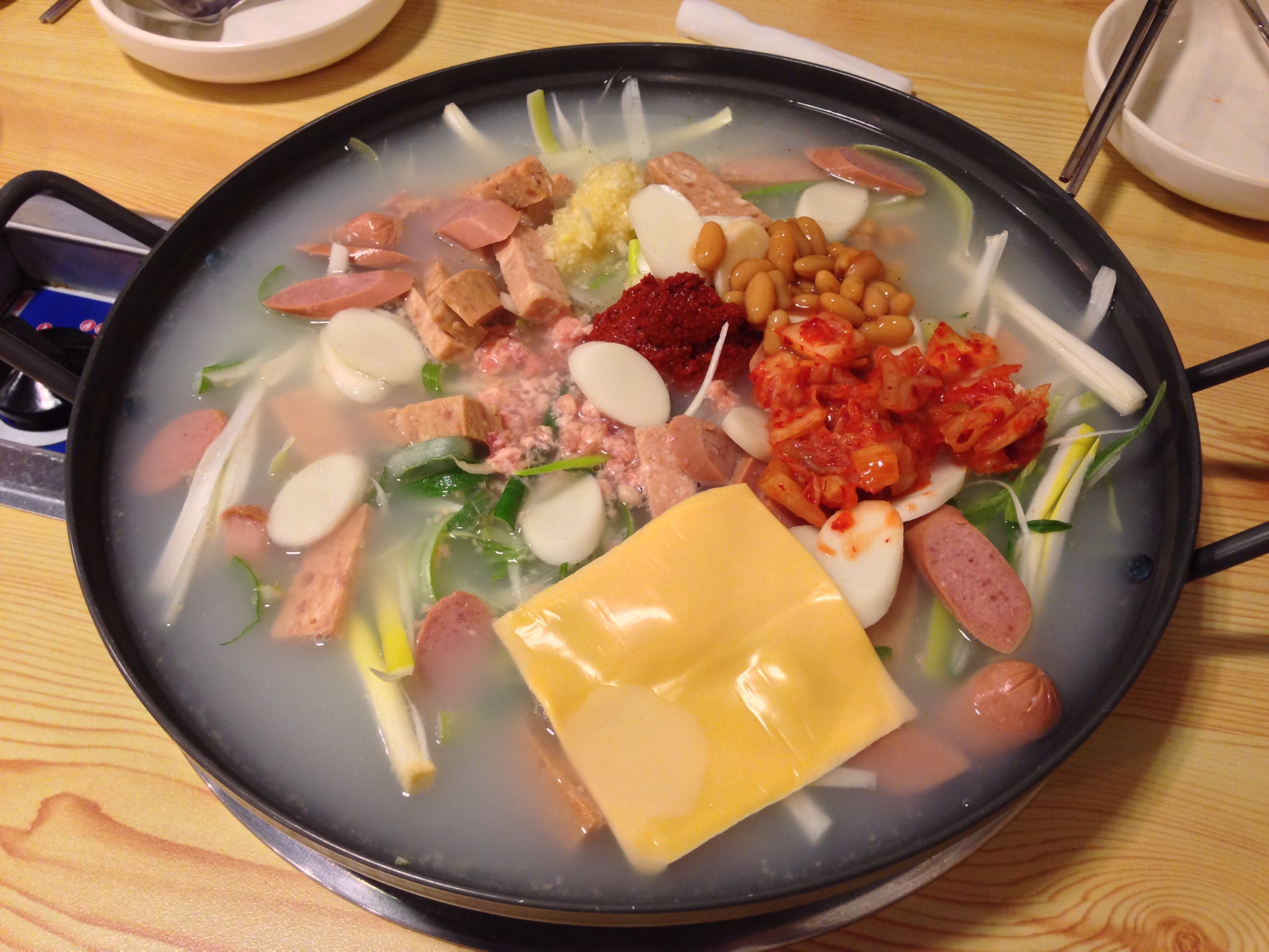 주 재료 | 햄, 핫도그, 스팸, 구운 콩, 김치, 인스턴트 라면, 고추장, 아메리칸 치즈 |