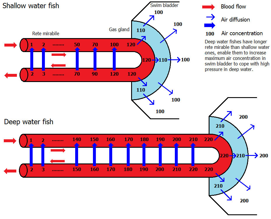 기체샘은 젖산을 배출하고 이산화탄소를 생성하여 ''기적망''의 혈액을 산성화시킨다. 이산화탄소는 중탄산염 완충계를 통해 혈액을 더욱 산성화시키고, 이는 혈액의 헤모글로빈이 산소를 잃게 한다(루트 효과). 이렇게 방출된 산소는 부레로 확산된다. 혈액은 ''기적망''으로 다시 들어가 과도한 이산화탄소와 산소가 역류 증폭 루프를 통해 기체샘에 산소를 공급하는 동맥으로 확산된다. 이러한 과정을 통해 심해어의 부레에는 매우 높은 산소 기체 압력이 유지될 수 있다.[5]