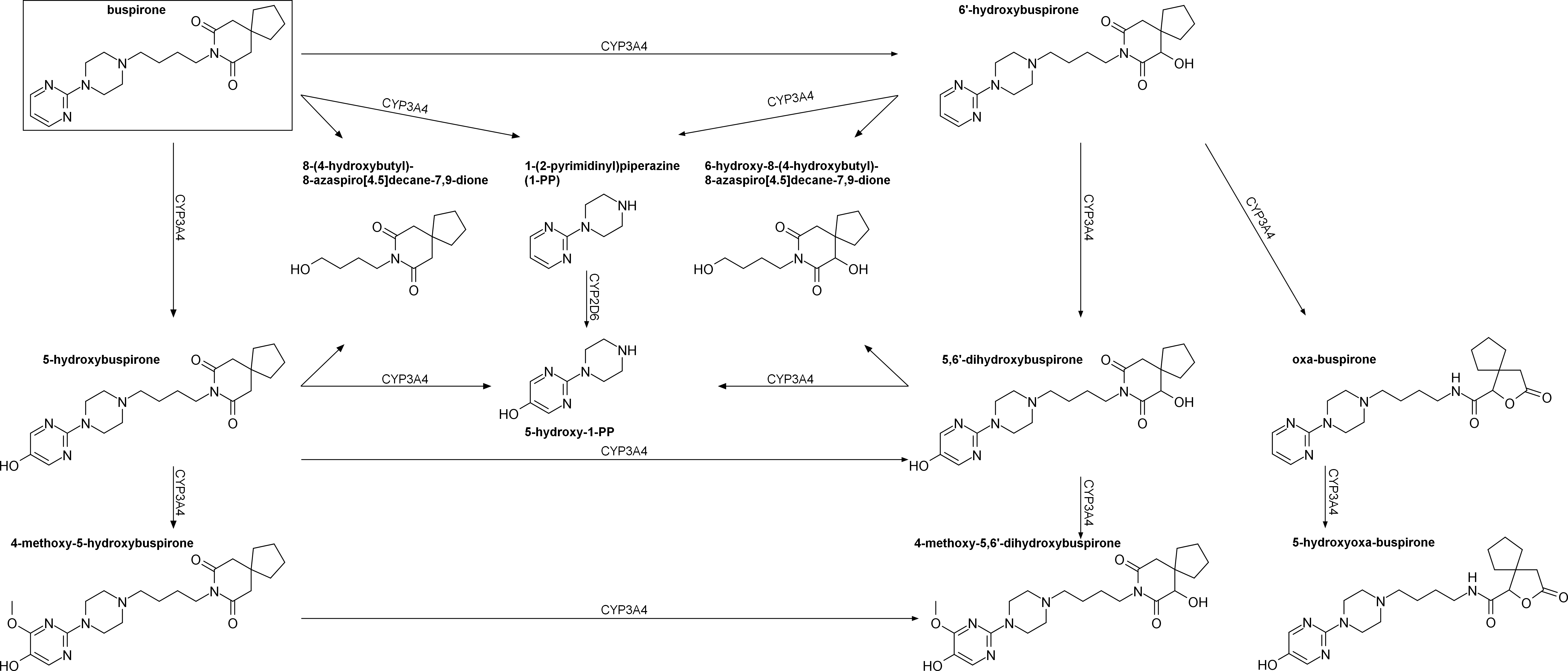 부스피론은 ''생체 외''에서 효소 CYP3A4에 의해 대사되는 것으로 나타났다.[4] 이러한 발견은 부스피론과 시토크롬 P450 3A4(CYP3A4)의 억제제 또는 유도제 사이에서 관찰된 ''생체 내'' 상호작용과 일치한다.[25]