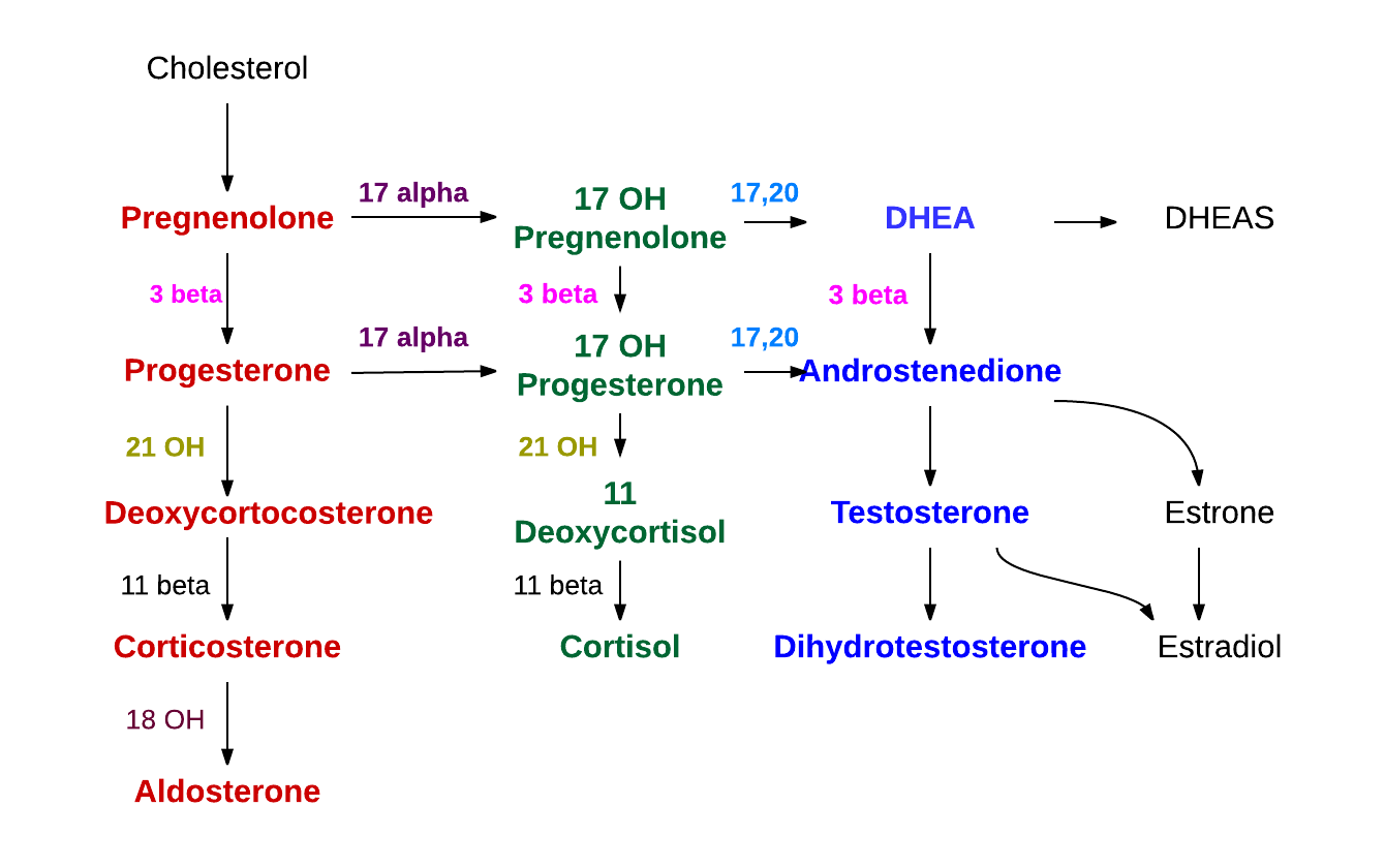 이 시점까지의 단계는 많은 스테로이드 생성 조직에서 발생한다. 그러나 알도스테론과 코르티솔을 생성하기 위한 후속 단계는 주로 부신 겉질에서 발생한다.