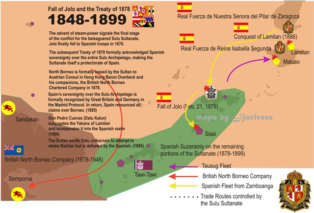 스페인은 1878년 7월 22일 술루 술탄과 체결한 "평화와 항복의 기초"에 따라 술루 술탄의 모든 소유지에 대한 주권을 양도받았다.[30] 술루 술탄은 술루 군도 전체와 그 부속물에 대한 스페인의 주권을 선언했다.[31]1885년, 영국, 독일과 스페인은 마드리드 의정서에 서명하여 필리핀 제도에 대한 스페인의 영향력을 강화했다. 이 협정에서 스페인은 과거 술탄국에 속했던 북보르네오에 대한 모든 권리를 영국에 양도했다.[32]
