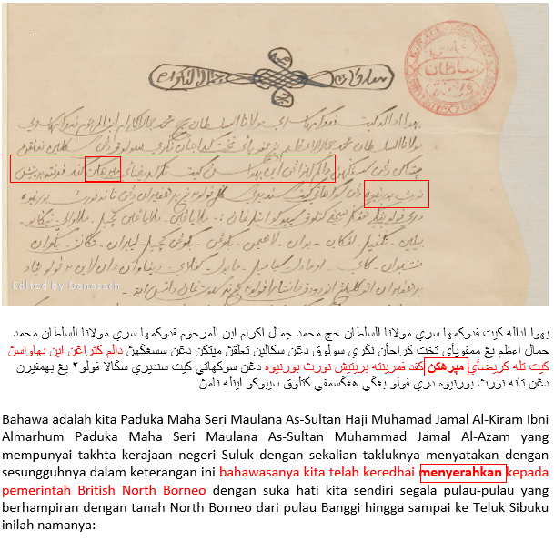 해당 영토에 대한 배타적 권한에 대한 번역 역시 논쟁적이다. 원래 자위 문자와 영어 번역에서는 영국 여왕 폐하(말레이어로는 ''Duli Queen'')가 배타적 권한을 가지며 중재는 보르네오 영국 총영사가 단독 결정하지만, 타우스그어 번역에서는 "그들의 폐하 정부"로 바뀌었다.