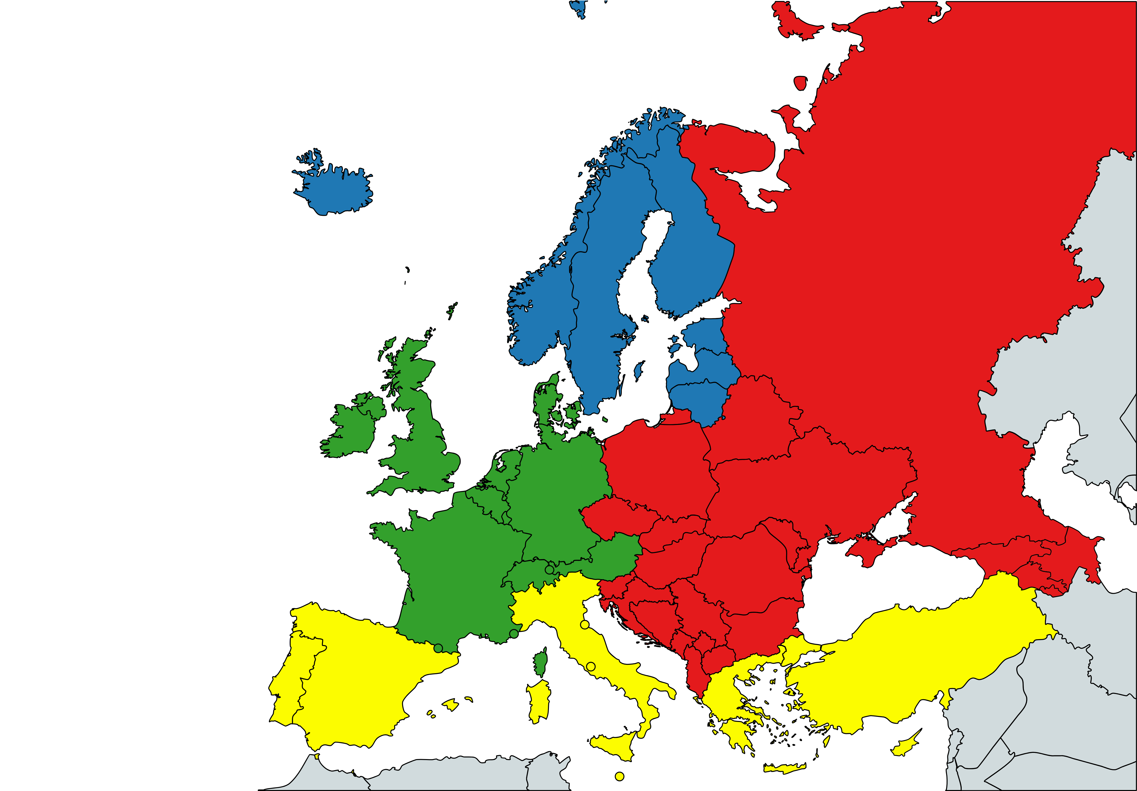 (이 분류에서는 저지, 건지, 맨섬, 영국, 아일랜드는 서유럽에 포함된다.)