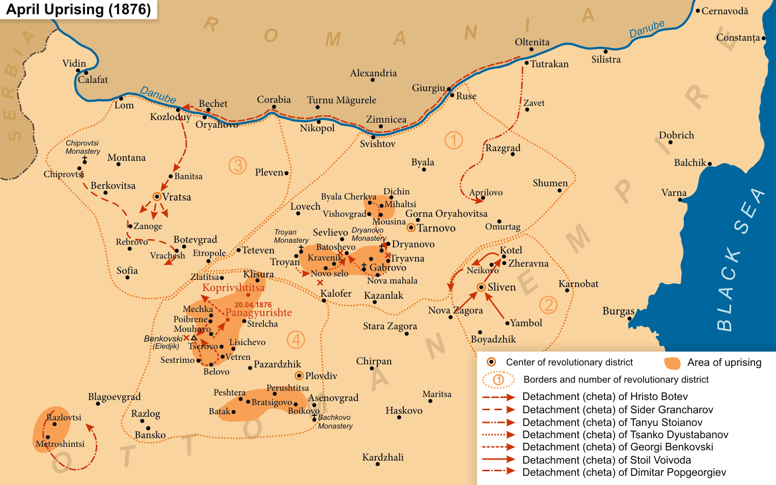 1876년 4월 봉기는 불가리아인들이 일으킨 봉기이다. 이 반란은 제대로 조직되지 않았고 예정보다 일찍 시작되었다. 주로 플로프디프 지역을 중심으로 일어났지만, 북부 불가리아, 마케도니아, 슬리벤 지역도 참여했다. 오스만 제국은 바쉬보주크라는 비정규군을 동원하여 봉기를 진압했다. 이 과정에서 수많은 마을이 약탈당하고 바타크, 페루슈티차, 브라치고보 등 플로프디프 지역을 중심으로 수만 명이 학살당했다.[1]이 학살은 윌리엄 유어트 글래드스턴을 비롯한 유럽 자유주의자들 사이에서 큰 반향을 일으켰다. 글래드스턴은 "불가리아 학살"에 대한 항의 운동을 시작했고, 많은 유럽 지식인과 유명 인사들이 이에 동참했다. 특히 러시아에서 강한 반향이 일어났다. 4월 봉기에 대한 유럽의 격렬한 반응은 1876년-1877년 콘스탄티노폴리스 회의로 이어졌다.[1]