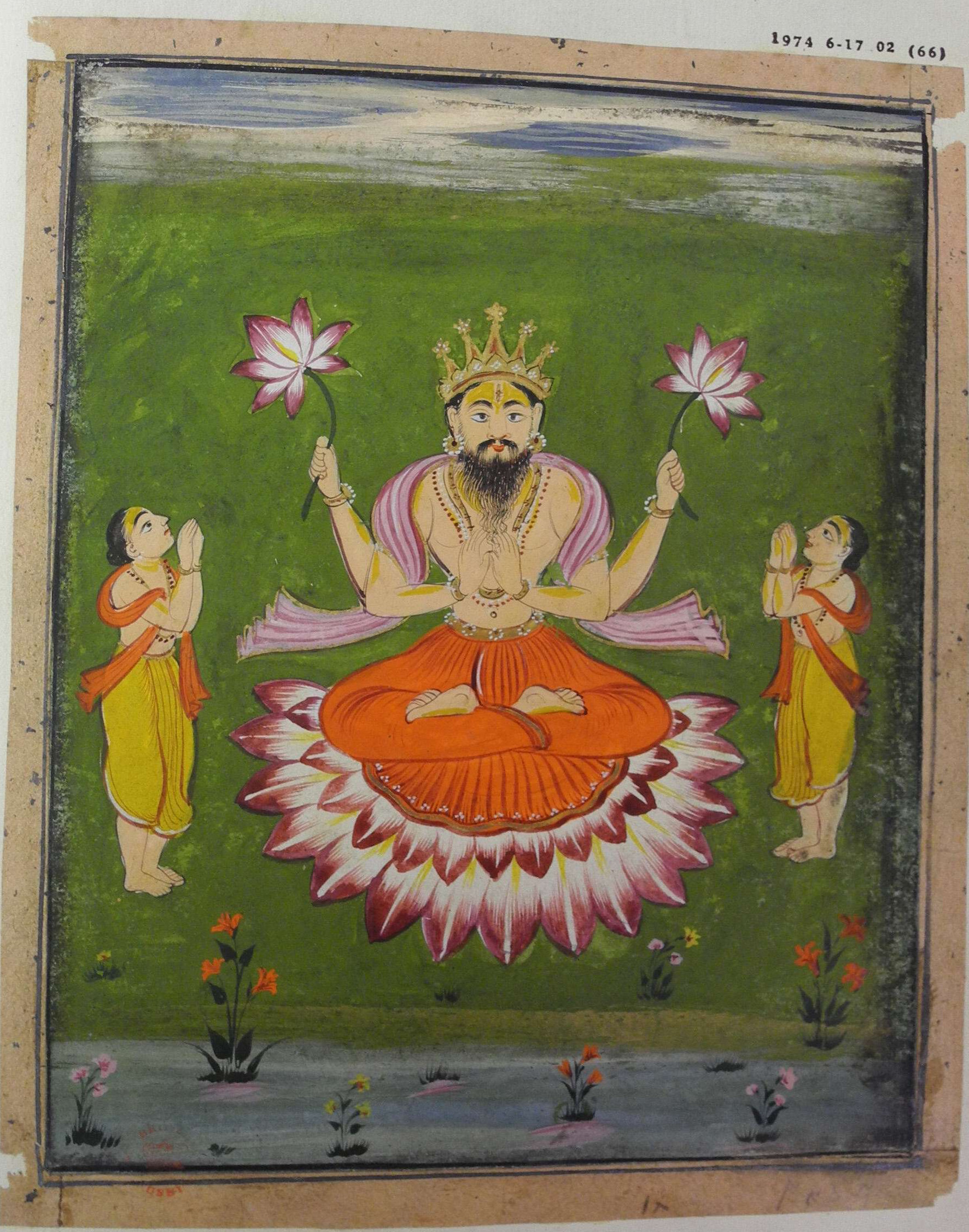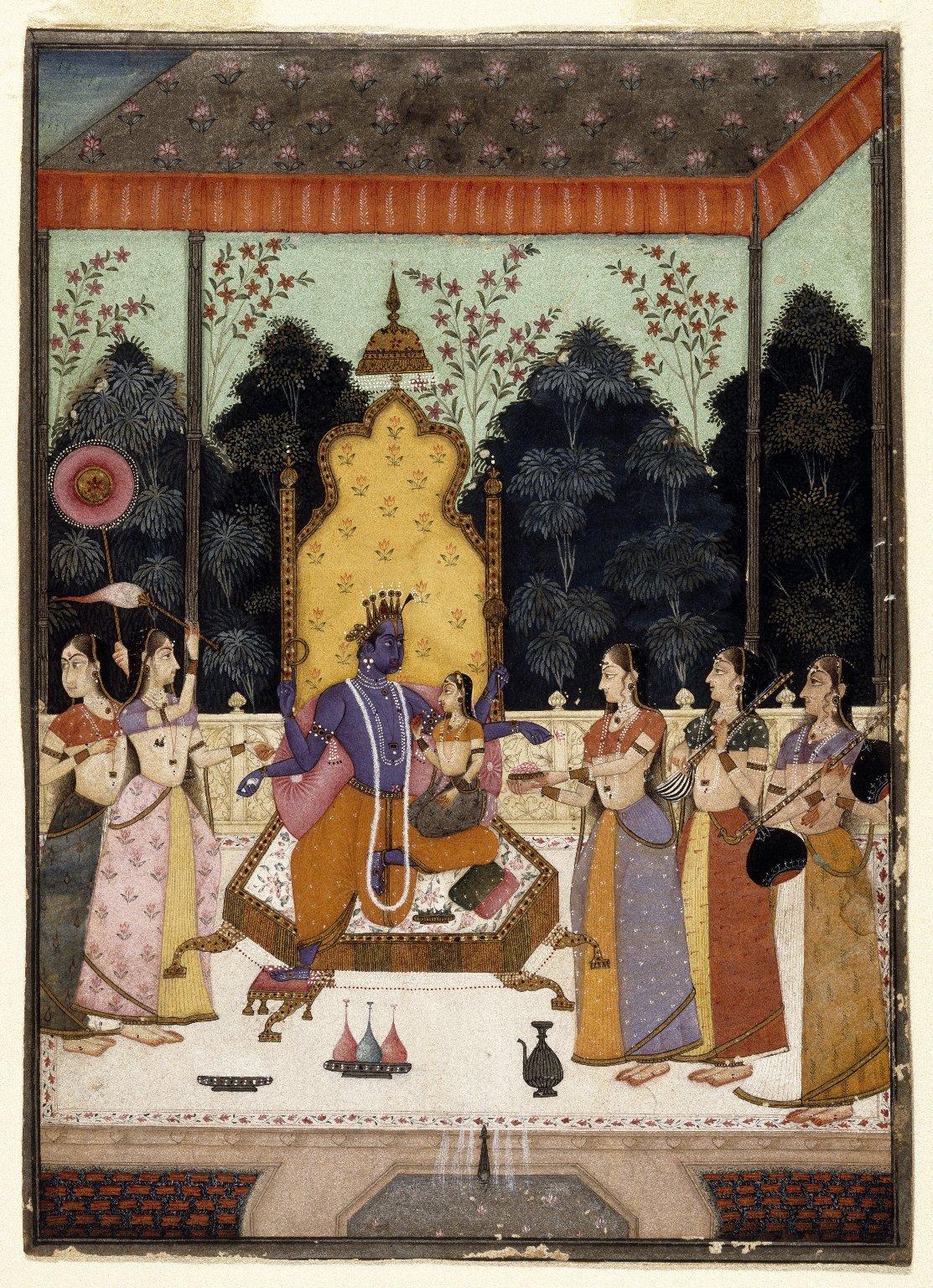 비슈누락슈미바이쿤타의 영원한 거처에 있는 신도들에게 둘러싸인 그림, 대부분의 바이슈나바교에서 가장 높은 영적 목표