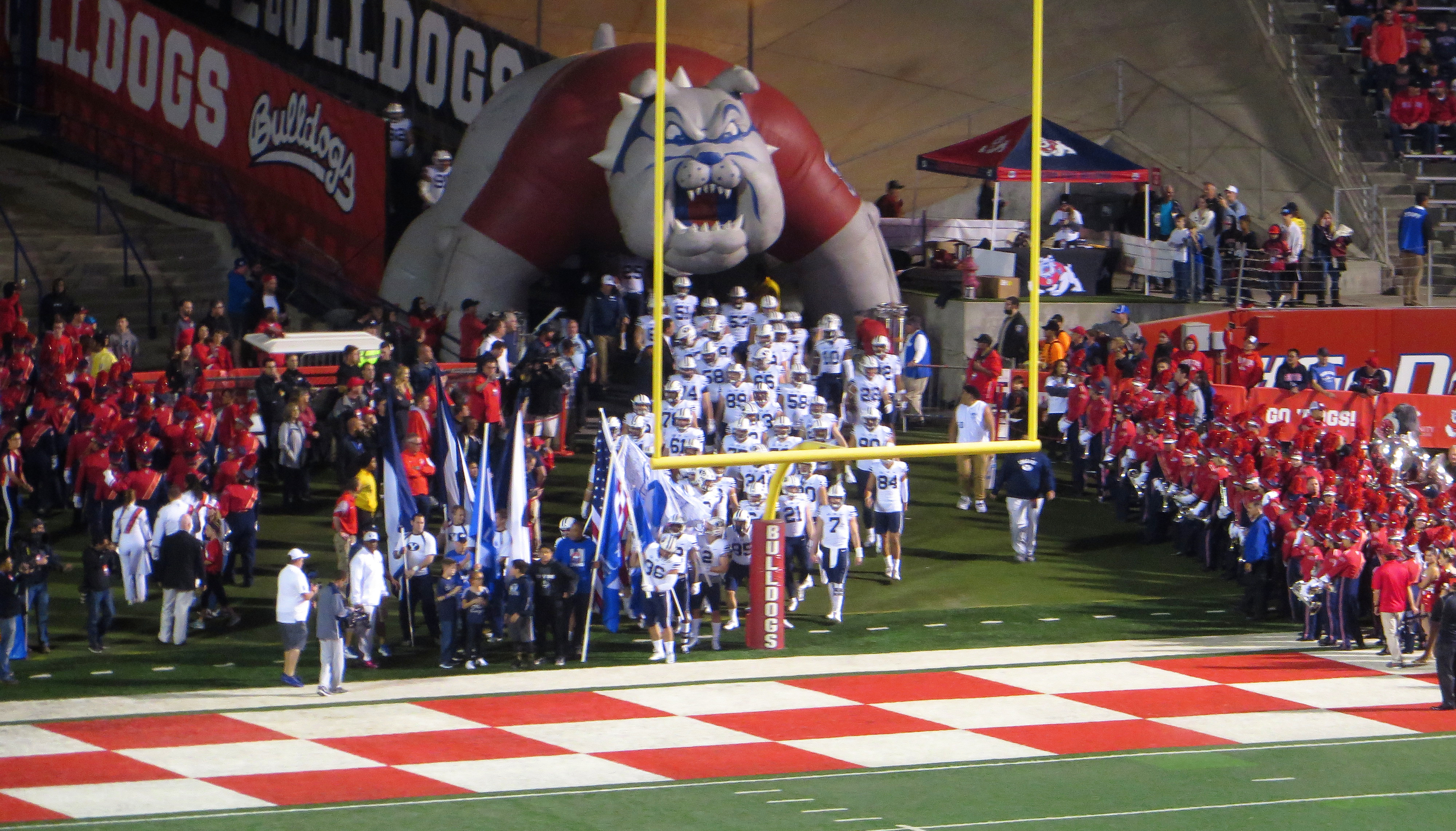 프레즈노 주립 대학교의 불독 마스코트는 중앙에 확대된 스타일로 묘사된다. 녹색과 빨간색 "V"는 샌호아킨 밸리의 농업 공동체에 대한 헌사로 25야드 라인에 나타나며, 선수 헬멧 뒷면에 착용하는 디자인과 일치한다.[7]