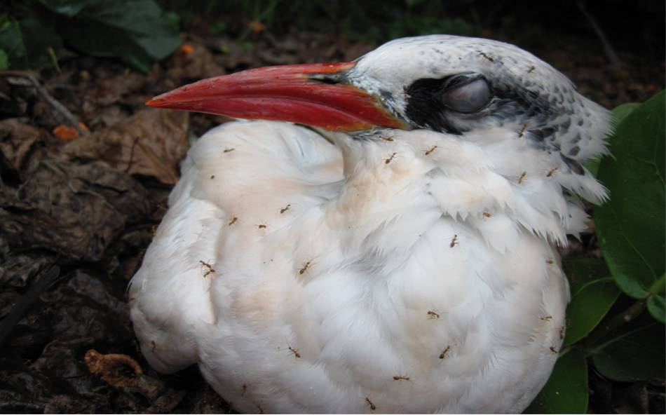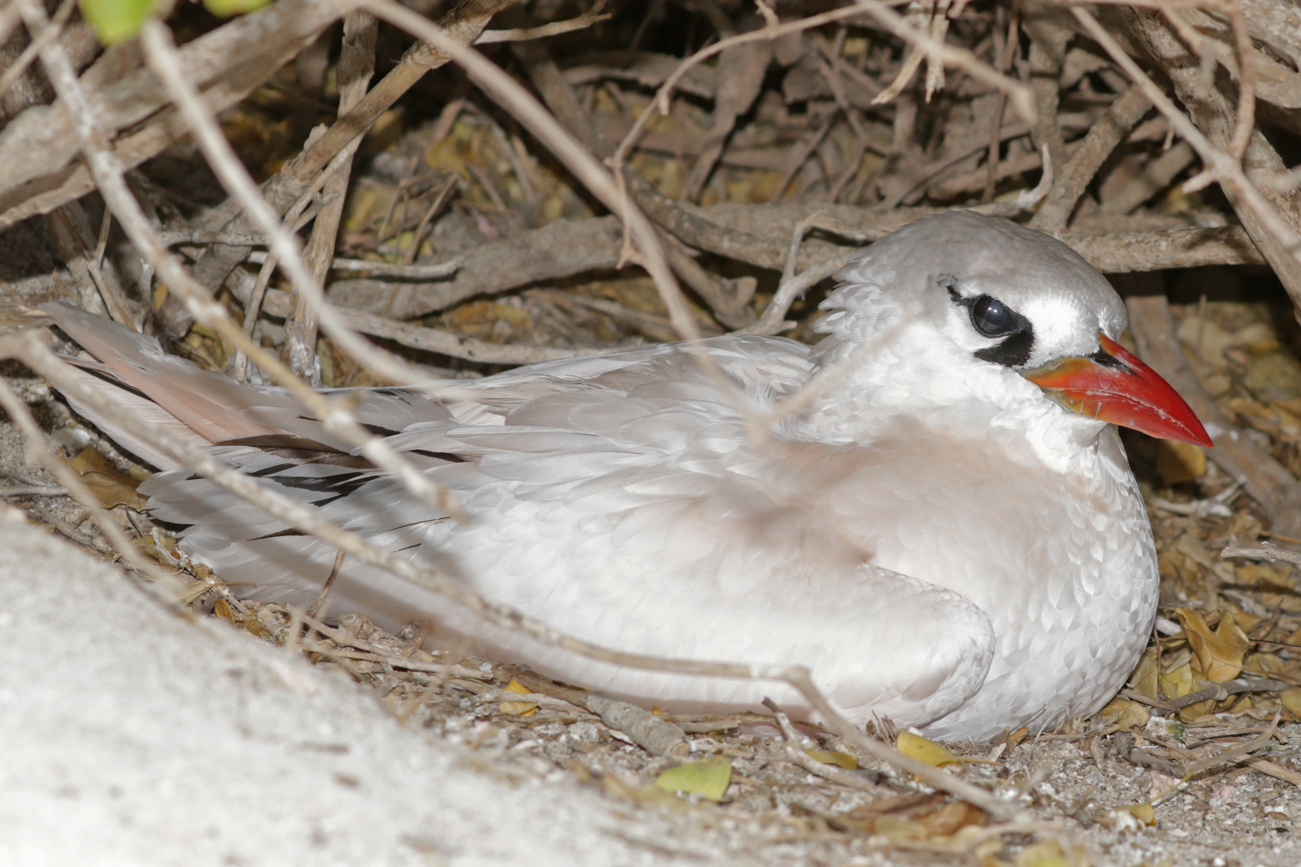 붉은부리열대새는 붉은색 부리와 긴 흰색 꼬리깃털을 가진 열대새과의 새로, 열대 해역에 서식하며 어류와 오징어를 먹지만, 침입종과 환경 오염으로 개체 수가 감소하고 있다. - 레위니옹의 새 - 레위니옹따오기