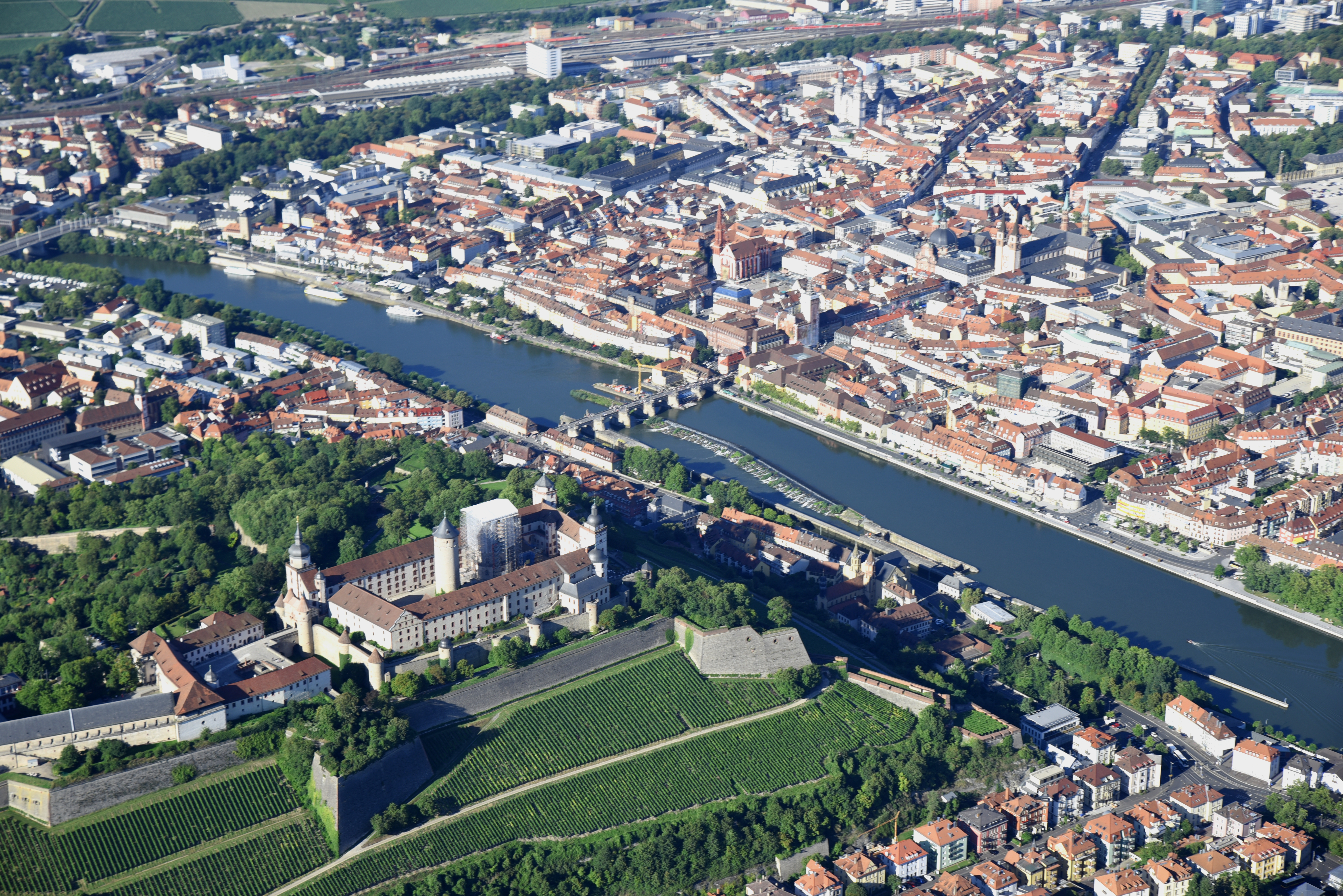 뷔르츠부르크는 독일 바이에른주 북부 프랑켄 지방의 마인강 양안에 걸쳐 있다. 도시 중심부는 동쪽(우안)에 위치하며, 뷔르츠부르크군에 둘러싸여 있지만 그 일부는 아니다. 마인강의 침식 작용으로 형성된 서안의 석회암 고지대인 마리엔베르크에는 요새가 있다.[18]