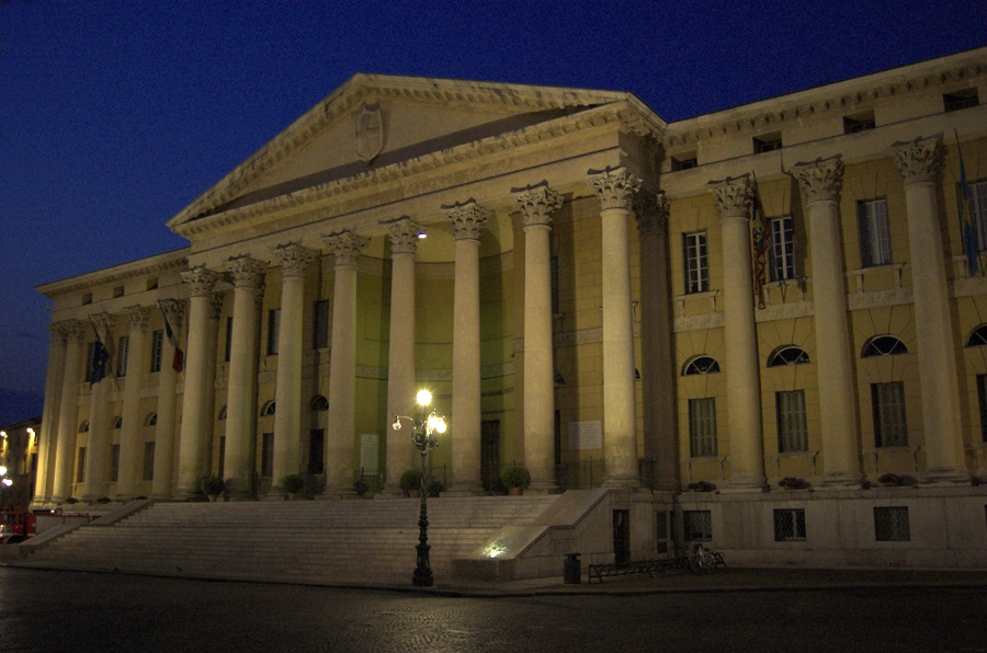 Palazzo della Gran Guardia|팔라초 델라 그란 과르디아it는 브라 광장의 남쪽 가장자리에 처음으로 세워진 건물이다. 원래 도메니코 쿠르토니가 기존 벽에서 여러 기둥으로 뻗어나가는 지붕 형태로 설계했다. 베네치아 공화국의 90대 도제인 레오나르도 도나토는 악천후 속에서 병사들이 쉴 수 있는 공간을 만들기 위해 이 건물의 건설을 요청했다. 공사는 1610년에 시작되었지만, 자금 부족으로 인해 중단되었다. 거의 200년이 지난 1808년에 건축가 주세페 바르비에리가 프로젝트를 이어받아 설계를 완성하도록 위촉되었으나, 실제 완공까지는 45년이 더 걸렸다.[3]