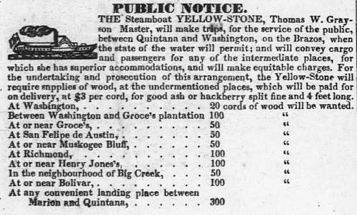 증기선 ''Yellow Stone''의 광고, 1836년 12월. 텍사스 공화국의 킨타나와 워싱턴 사이의 패킷 서비스.