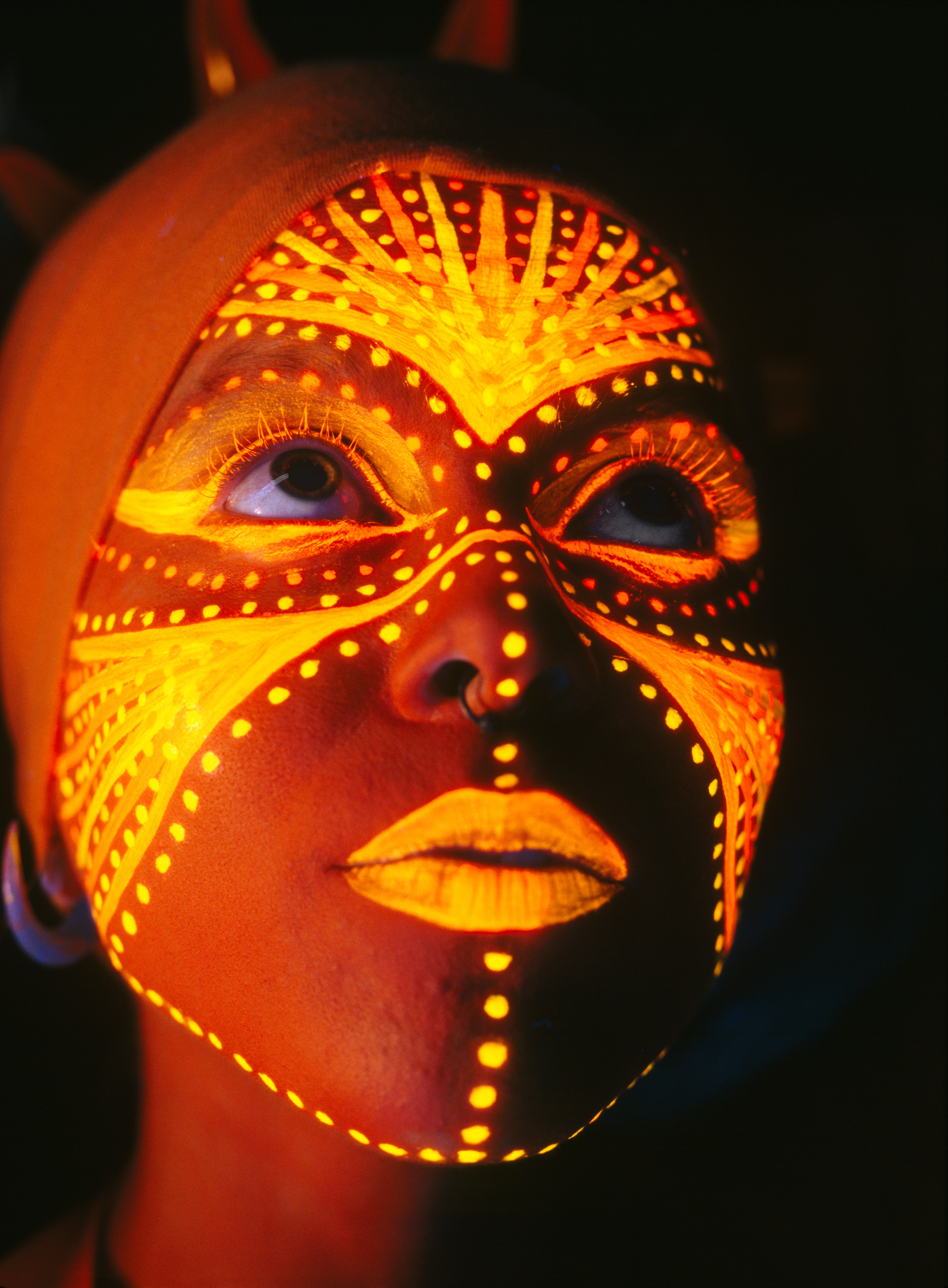 블랙라이트는 특히 검은색 벨벳에 형광색으로 칠해진 그림을 밝히는 데 사용되어 자체 발광의 환상을 강화한다. 이러한 재료는 종종 UV 광선 아래 감각 룸에서 보이는 타일 형태로 사용되며, 영국에서는 심각하고 다중 학습 장애가 있는 학생들을 교육하는 데 일반적이다.[25] 특히 광학 증백제 잔류물을 포함하는 특정 섬유에서 발생하는 이러한 형광은, 예를 들어 제임스 본드 영화 ''007 뷰 투 어 킬''의 오프닝 크레딧에서 볼 수 있듯이, 오락적인 효과를 위해 사용될 수도 있다. 블랙라이트 인형극은 블랙라이트 극장에서 공연된다.