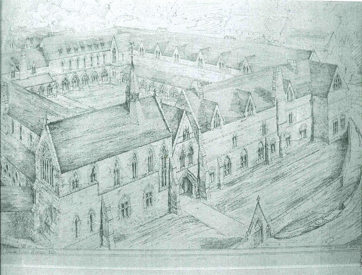 성공회 부목사였던 존 윌리엄 휴엣(1824–1886)은 1853년에 블록섬 마을 북쪽에 학교를 설립하였다.[3] 이 학교는 사무엘 윌버포스의 지원을 받았으며, 그는 교구 건축가인 조지 에드먼드 스트리트에게 새로운 학교 건물 설계를 의뢰했다.[4] 1855년 6월 7일, 윌버포스는 주춧돌을 축복했다. 휴엣은 100명의 일반 학생, 40명의 장학생, 그리고 불특정 수의 성가대를 위한 학교를 계획하고 있었다. 그러나 1856년 중반, 휴엣은 파산했고 학교는 예상보다 높은 수업료를 지불해야 하는 충분한 수의 학생들을 유치하지 못했다.[3] 결국 수십 명의 학생과 미완성된 건물을 가진 휴엣의 학교는 1857년 4월에 문을 닫았다.
