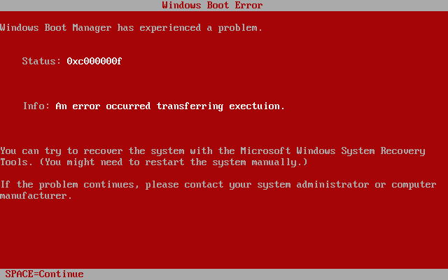 BSoD는 잘못된 저장 드라이버, 손상된 파일 시스템 또는 유사한 문제로 인해 운영 체제가 부팅 파티션에 액세스할 수 없는 중요한 부팅 로더 오류로 인해 발생할 수도 있다. 이 경우의 오류 코드는 STOP: 0x0000007B (INACCESSIBLE_BOOT_DEVICE)이다.[32]